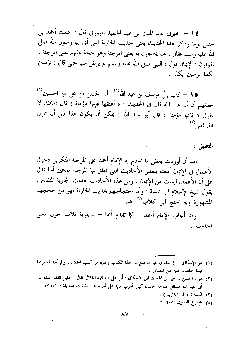 14 - أخبرنى عبد الملك بن عبد الحميد الميمونى قال: سمعت أحمد بن حنبل يوما. وذكر هذا الحديث يعنى حديث الجارية التى أتى بها رسول اللّه صلى اللّه عليه وسلم فقال: هم يحتجون به يعنى المرجئة وهو حجة عليهم يعنى المرجئة.