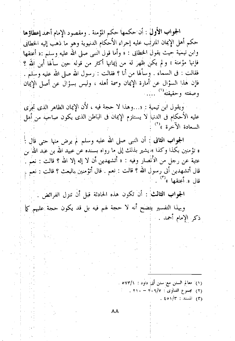 الجواب الأول: أن حكمها حكم المؤمنة. ومقصود الإمام أحمد إعطاؤها حكم أهل الإيمان المترتب عليه إجراء الأحكام الدنيوية وهو ما ذهب إليه الخطابى وابن تيمية حيث يقول الخطابى: «و أما قول النبي صلى اللّه عليه وسلم: «أعتقها فإنها مؤمنة» ولم يكن ظهر له من إيمانها أكثر من قوله حين سألها أين اللّه؟