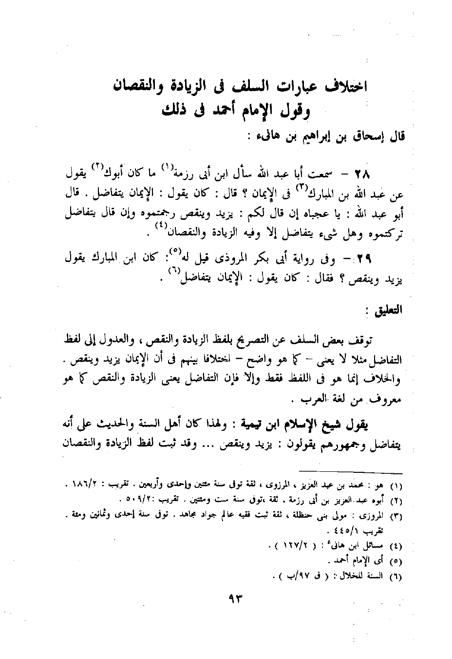 29 - وفى رواية أبى بكر المروزي قيل له «5»: كان ابن المبارك يقول يزيد وينقص؟ فقال: كان يقول: الإيمان يتفاضل «6».