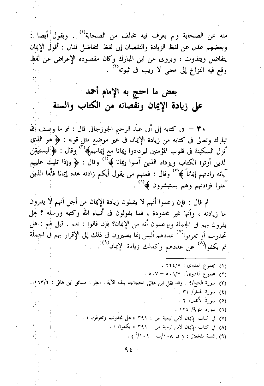 30 - فى كتابه إلى أبى عبد الرحيم الجوزجانى قال: ثم ما وصف اللّه تبارك وتعالى فى كتابه من زيادة الإيمان فى غير موضع مثل قوله: هُوَ الَّذِي أَنْزَلَ السَّكِينَةَ فِي قُلُوبِ الْمُؤْمِنِينَ لِيَزْدادُوا إِيماناً مَعَ إِيمانِهِمْ «3» وقال: لِيَسْتَيْقِنَ الَّذِينَ أُوتُوا الْكِتابَ ويَزْدادَ الَّذِينَ آمَنُوا إِيماناً «4» وقال: وإِذا تُلِيَتْ عَلَيْهِمْ آياتُهُ زادَتْهُمْ إِيماناً «5» وقال: فَمِنْهُمْ مَنْ يَقُولُ أَيُّكُمْ زادَتْهُ هذِهِ إِيماناً فَأَمَّا الَّذِينَ آمَنُوا فَزادَتْهُمْ إِيماناً وهُمْ يَسْتَبْشِرُونَ «6».