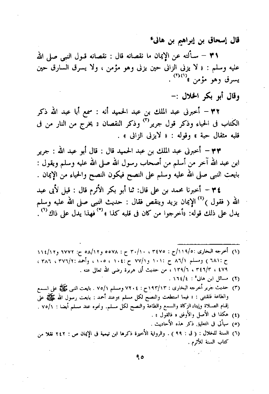 34 - أخبرنا محمد بن على قال: حدثنا أبو بكر الأثرم قال: قيل لأبى عبد اللّه (فقول) «4» الإيمان يزيد وينقص فقال: حديث النبي صلى اللّه عليه وسلم يدل على ذلك قوله: «أخرجوا من كان فى قلبه كذا» «5» فهذا يدل على ذاك «6».