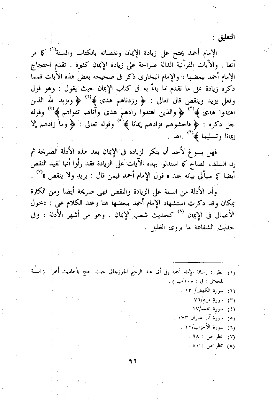 فهل يسوغ لأحد أن ينكر الزيادة فى الإيمان بعد هذه الأدلة الصريحة ثم إن السلف الصالح كما استدلوا بهذه الآيات على الزيادة فقد رأوا أنها تفيد النقص أيضا كما سيأتى بيانه عند «قول الإمام أحمد فيمن قال: يزيد ولا ينقص» «7».