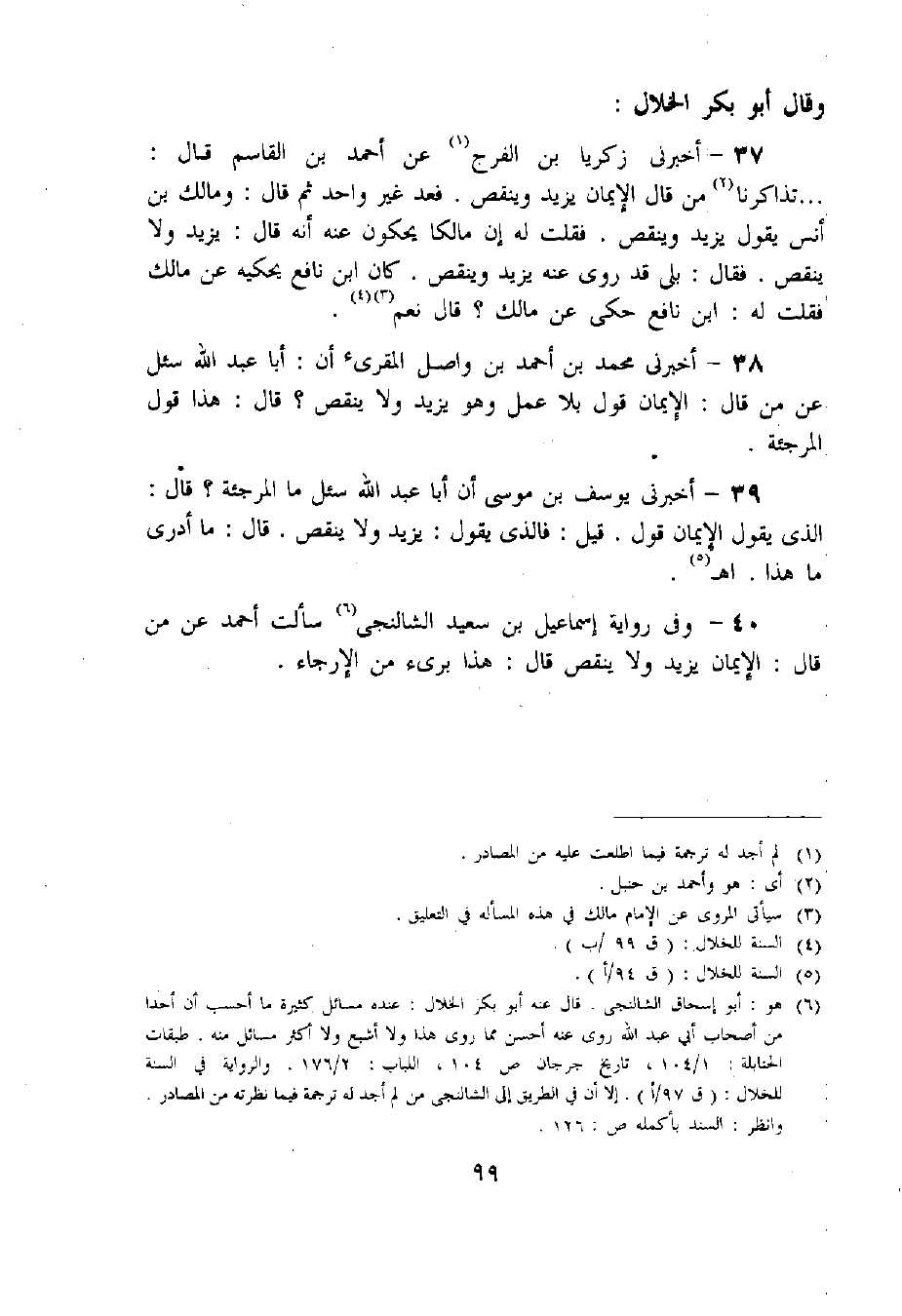 38 - أخبرنى محمد بن أحمد بن واصل المقرئ أن: أبا عبد اللّه سئل عن من قال: الإيمان قول بلا عمل وهو يزيد ولا ينقص؟ قال: هذا قول المرجئة.