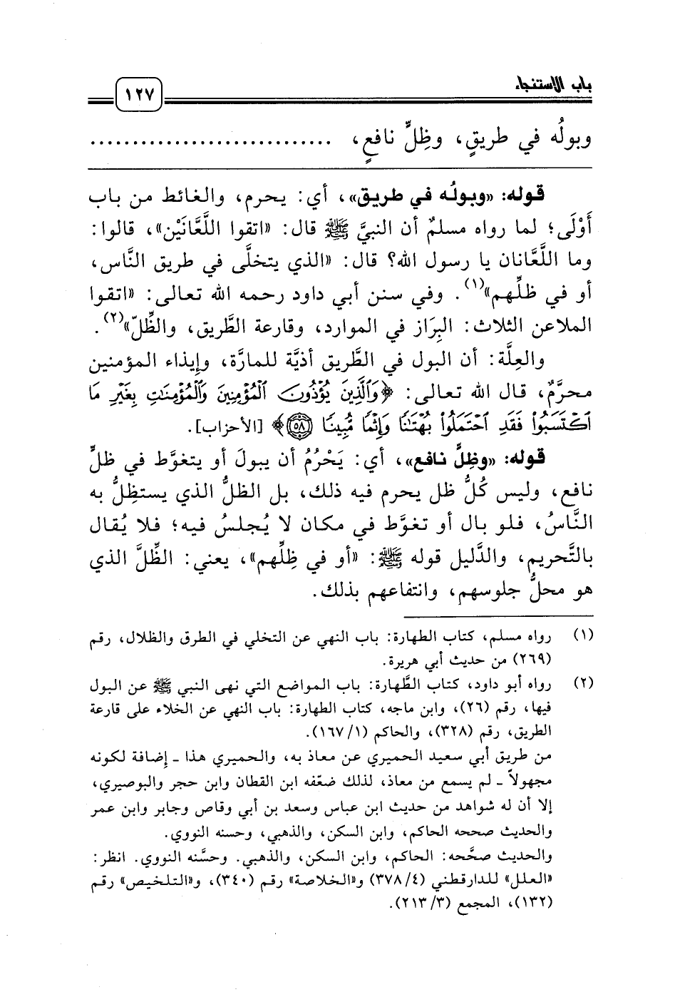 (¬2) رواه أبو داود، كتاب الطَّهارة: باب المواضع التي نهى النبي صلّى الله عليه وسلّم عن البول فيها، رقم (26)، وابن ماجه، كتاب الطهارة: باب النهي عن الخلاء على قارعة الطريق، رقم (328)، والحاكم (1/ 167).