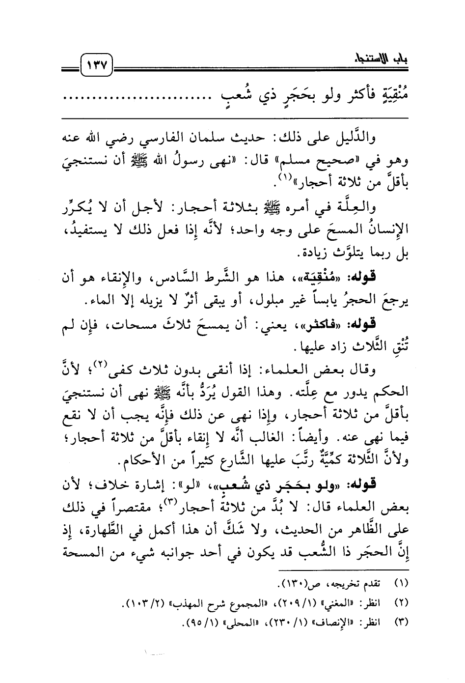 وقال بعض العلماء: إذا أنقى بدون ثلاث كفى (¬2)؛ لأنَّ الحكم يدور مع عِلَّته. وهذا القول يُرَدُّ بأنَّه صلّى الله عليه وسلّم نهى أن نستنجيَ بأقلَّ من ثلاثة أحجار، وإِذا نهى عن ذلك فإِنَّه يجب أن لا نقع فيما نهى عنه. وأيضاً: الغالب أنَّه لا إِنقاء بأقلَّ من ثلاثة أحجار؛ ولأنَّ الثَّلاثة كمِّيَّةٌ رتَّبَ عليها الشَّارع كثيراً من الأحكام.