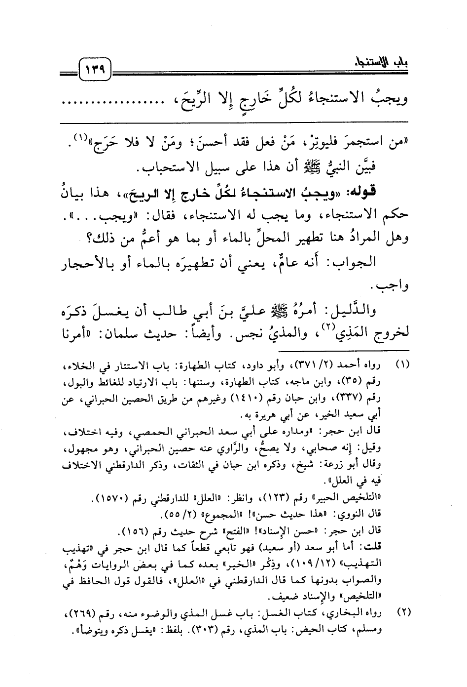 (¬2) رواه البخاري، كتاب الغسل: باب غسل المذي والوضوء منه، رقم (269)، ومسلم، كتاب الحيض: باب المذي، رقم (303). بلفظ: «يغسل ذكره ويتوضأ».