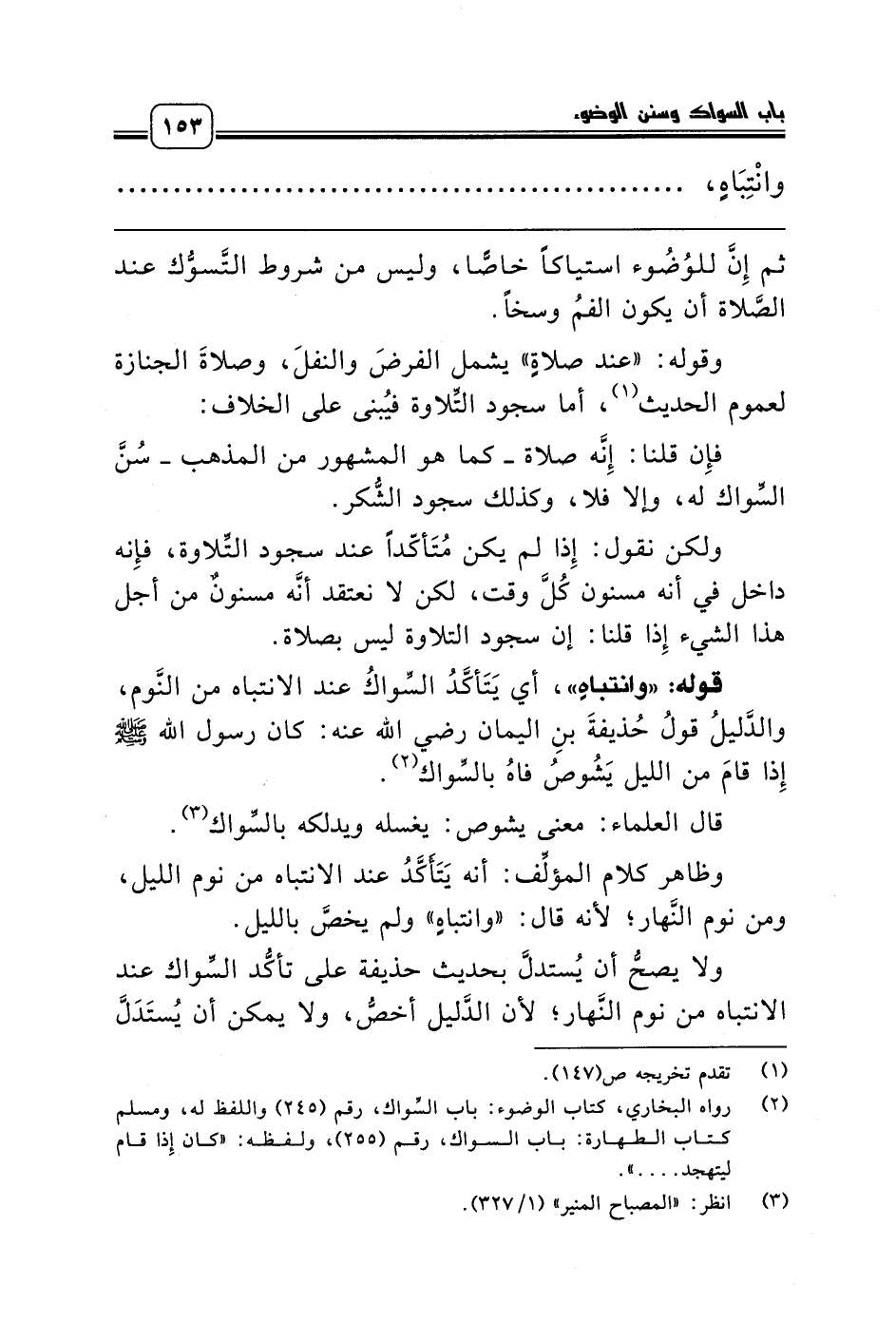 قوله: «وانتباهٍ»، أي يَتَأكَّدُ السِّواكُ عند الانتباه من النَّوم، والدَّليلُ قولُ حُذيفةَ بنِ اليمان رضي الله عنه: كان رسول الله صلّى الله عليه وسلّم إِذا قامَ من الليل يَشُوصُ فاهُ بالسِّواك (¬2).