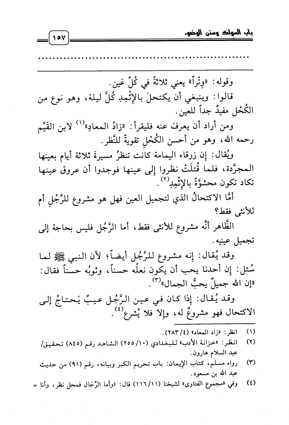 وقد يُقال: إِنه مشروع للرَّجُل أيضاً؛ لأن النبي صلّى الله عليه وسلّم لما سُئل: إِن أحدنا يحب أن يكون نعلُه حسناً، وثوبُه حسناً فقال: «إن الله جميلٌ يحبُّ الجمال» (¬3).