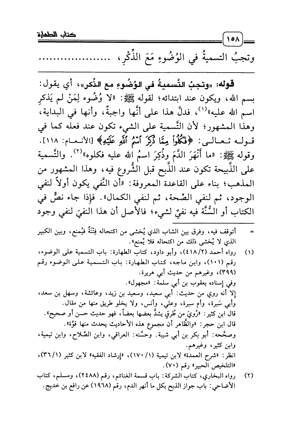 قوله: «وتجبُ التَّسميةُ في الوُضُوءِ مع الذِّكر»، أي يقول: بسم الله، ويكون عند ابتدائه؛ لقوله صلّى الله عليه وسلّم: «لا وُضُوء لِمَنْ لم يَذكرِ اسم الله عليه» (¬1)، فدلَّ هذا على أنَّها واجبةٌ، وأنها في البداية، وهذا المشهور؛ لأن التَّسمية على الشيء تكون عند فعله كما في قوله تعالى: {فَكُلُوا مِمَّا ذُكِرَ اسْمُ اللَّهِ عَلَيْهِ} [الأنعام: 118]. وقوله صلّى الله عليه وسلّم: «ما أَنْهَرَ الدَّمَ وذُكِرَ اسمُ الله عليه فكلوه» (¬2). والتَّسمية على الذَّبيحة تكون عند الذَّبح قبل الشُّروع فيه، وهذا المشهور من المذهب؛ بناء على القاعدة المعروفة: «أن النَّفي يكون أولاً لنفي الوجود، ثم لنفي الصِّحة، ثم لنفي الكمال». فإِذا جاء نصٌّ في الكتاب أو السُّنَّة فيه نفيٌ لشيء؛ فالأصل أن هذا النفيَ لنفي وجود