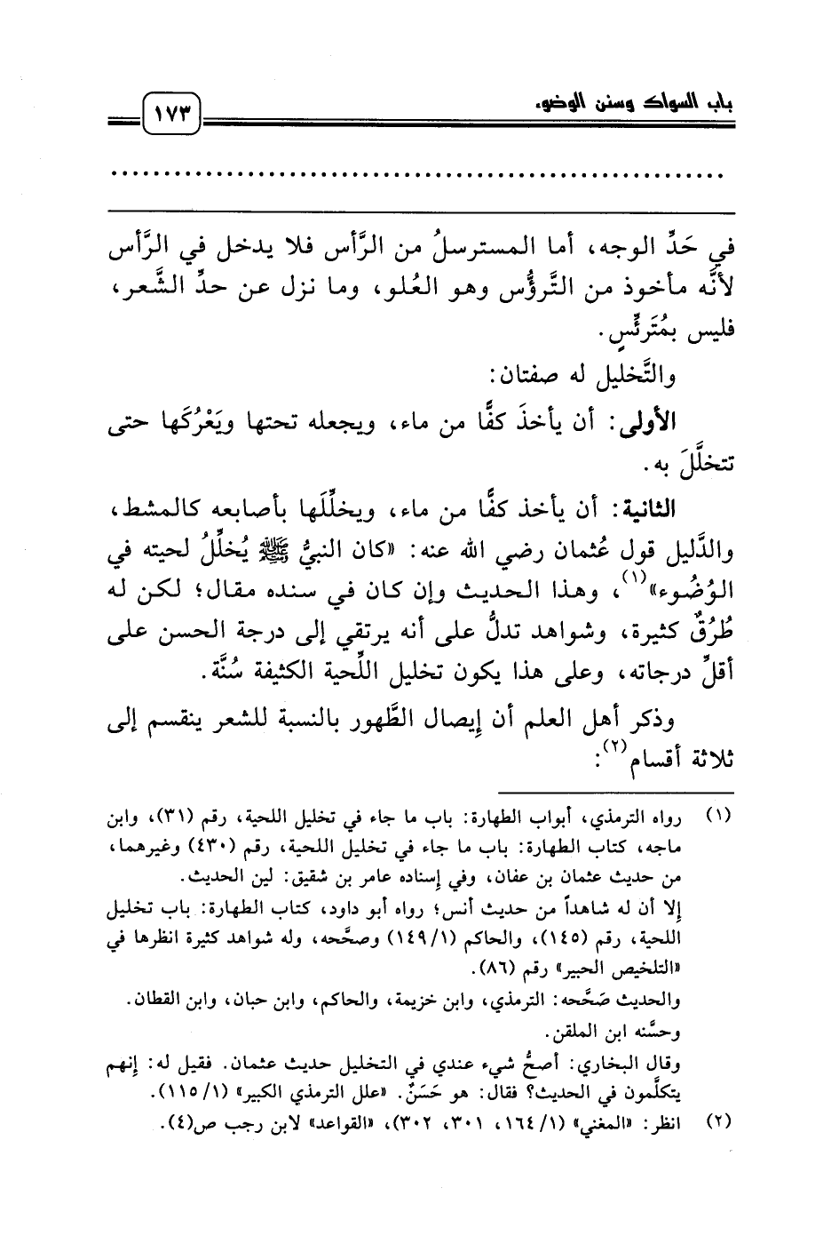 الثانية: أن يأخذ كفًّا من ماء، ويخلِّلَها بأصابعه كالمشط، والدَّليل قول عُثمان رضي الله عنه: «كان النبيُّ صلّى الله عليه وسلّم يُخلِّلُ لحيته في الوُضُوء» (¬1)، وهذا الحديث وإن كان في سنده مقال؛ لكن له طُرُقٌ كثيرة، وشواهد تدلُّ على أنه يرتقي إلى درجة الحسن على أقلِّ درجاته، وعلى هذا يكون تخليل اللِّحية الكثيفة سُنَّة.