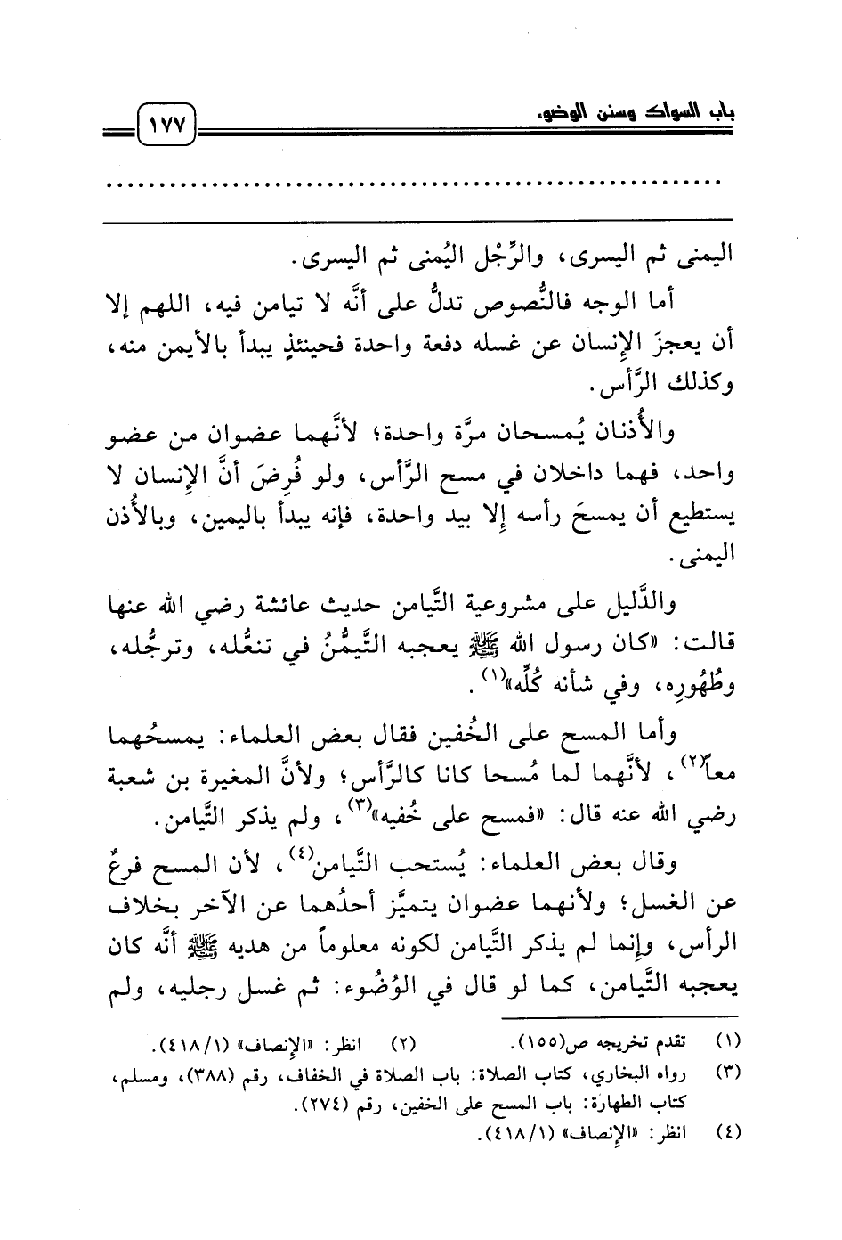وأما المسح على الخُفين فقال بعض العلماء: يمسحُهما معاً (¬2)، لأنَّهما لما مُسحا كانا كالرَّأس؛ ولأنَّ المغيرة بن شعبة رضي الله عنه قال: «فمسح على خُفيه» (¬3)، ولم يذكر التَّيامن.
