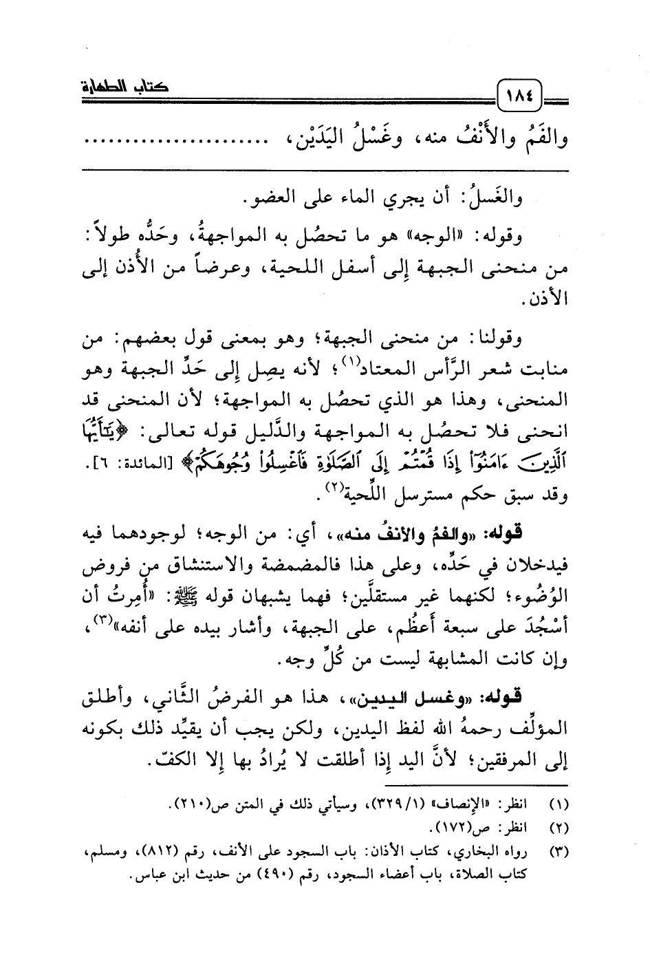 وقوله: «الوجه» هو ما تحصُل به المواجهةُ، وحَدُّه طولاً: من منحنى الجبهة إِلى أسفل اللحية، وعرضاً من الأُذن إلى الأذن.