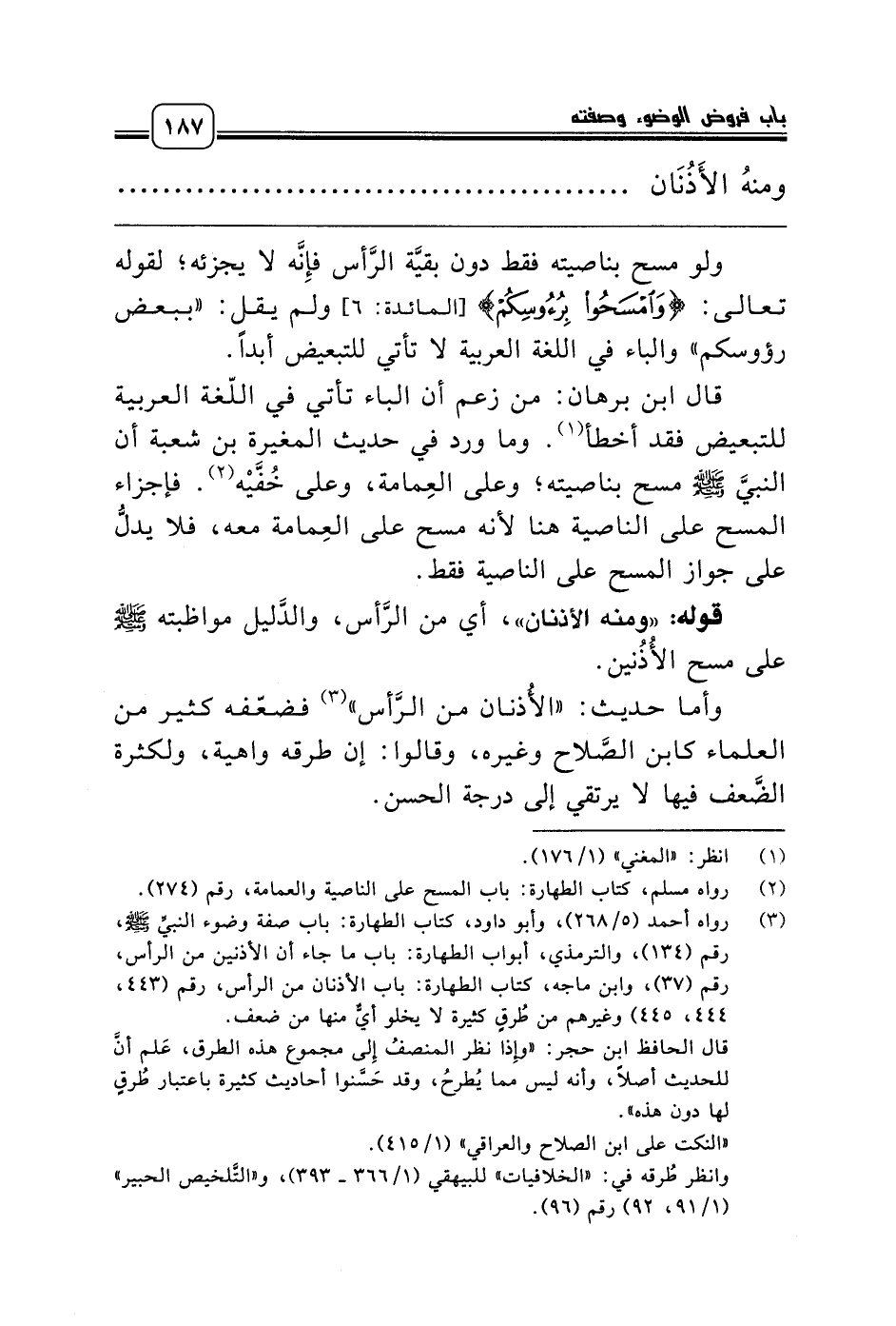 (¬3) رواه أحمد (5/ 268)، وأبو داود، كتاب الطهارة: باب صفة وضوء النبيِّ صلّى الله عليه وسلّم، رقم (134)، والترمذي، أبواب الطهارة: باب ما جاء أن الأذنين من الرأس، رقم (37)، وابن ماجه، كتاب الطهارة: باب الأذنان من الرأس، رقم (443، 444، 445) وغيرهم من طُرقٍ كثيرة لا يخلو أيٌّ منها من ضعف.