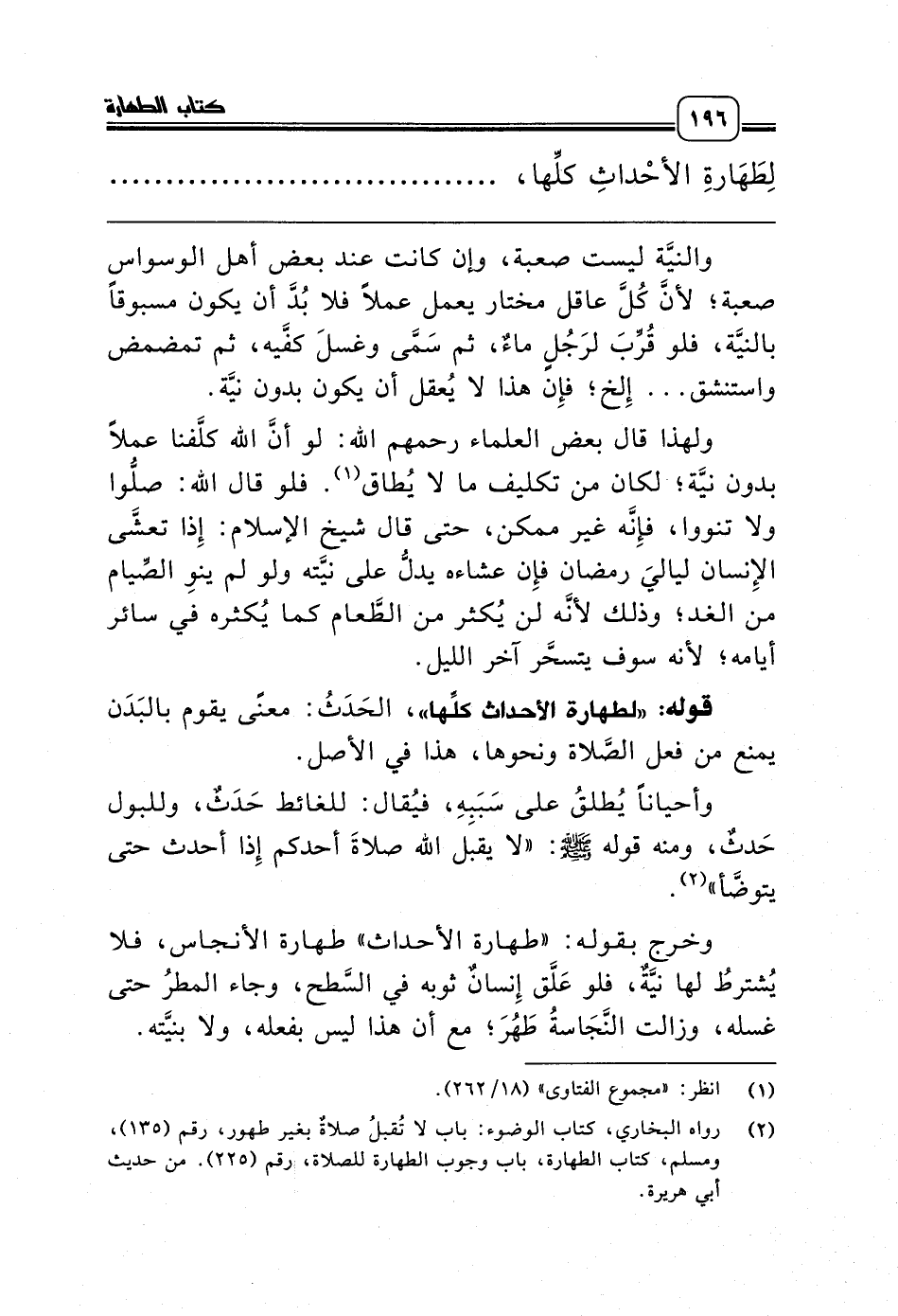(¬2) رواه البخاري، كتاب الوضوء: باب لا تُقبلُ صلاةٌ بغير طهور، رقم (135)، ومسلم، كتاب الطهارة، باب وجوب الطهارة للصلاة، رقم (225). من حديث أبي هريرة.