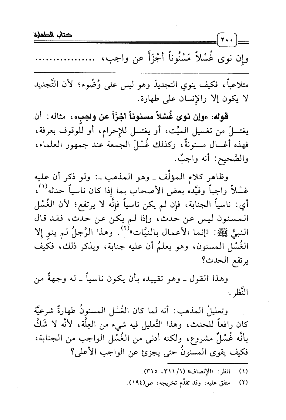 وتعليلُ المذهب: أنه لما كان الغُسْل المسنونُ طهارةً شرعيَّة كان رافعاً للحدث، وهذا التَّعليل فيه شيء من العِلَّة، لأنَّه لا شَكَّ بأنَّه غُسْلٌ مشروع، ولكنه أدنى من الغُسْل الواجب من الجنابة، فكيف يقوى المسنونُ حتى يجزئ عن الواجب الأعلى؟