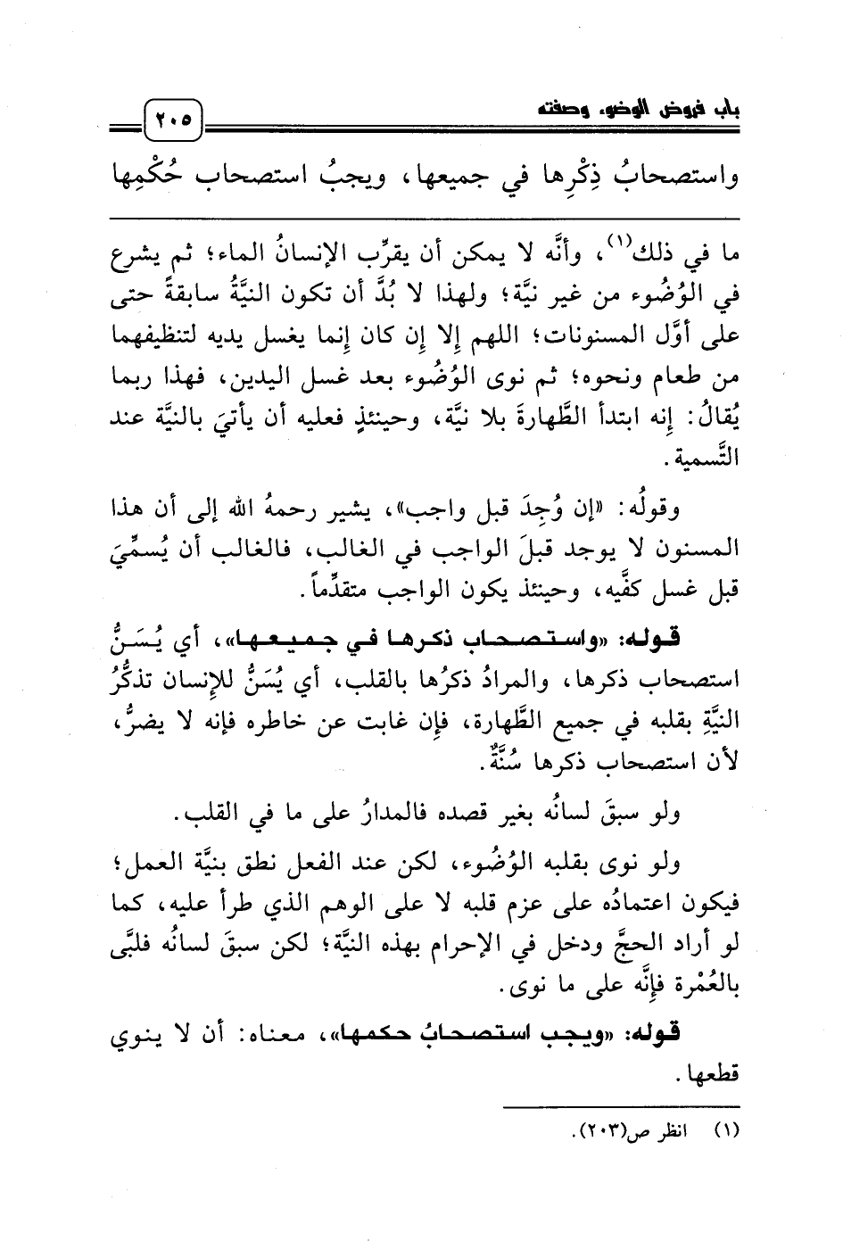 قوله: «واستصحاب ذكرها في جميعها»، أي يُسَنُّ استصحاب ذكرها، والمرادُ ذكرُها بالقلب، أي يُسَنُّ للإِنسان تذكُّرُ النيَّةِ بقلبه في جميع الطَّهارة، فإِن غابت عن خاطره فإنه لا يضرُّ، لأن استصحاب ذكرها سُنَّةٌ.