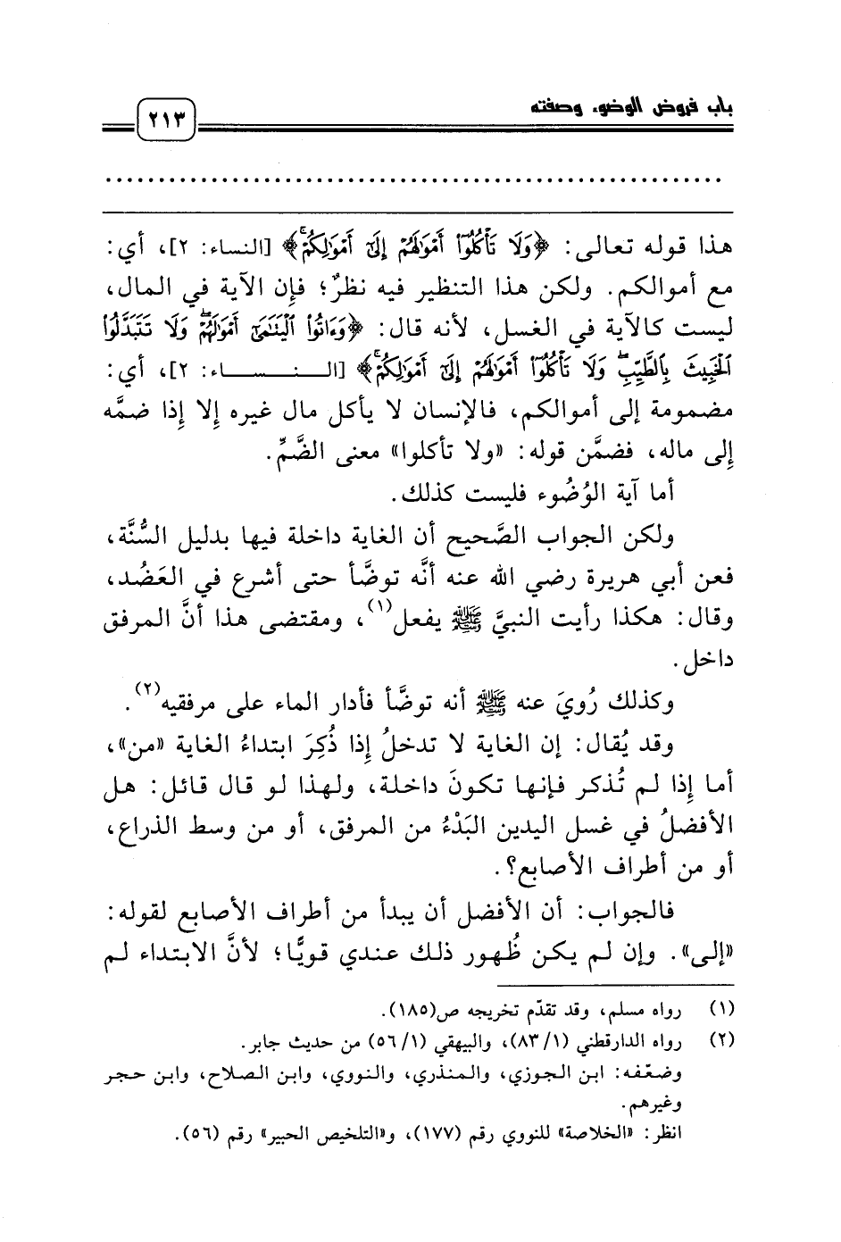هذا قوله تعالى: {وَلاَ تَأْكُلُوا أَمْوَالَهُمْ إِلَى أَمْوَالِكُمْ} [النساء: 2]، أي: مع أموالكم. ولكن هذا التنظير فيه نظرٌ؛ فإِن الآية في المال، ليست كالآية في الغسل، لأنه قال: {وَآتُوا الْيَتَامَى أَمْوَالَهُمْ ولاَ تَتَبَدَّلُوا الْخَبِيثَ بِالطَّيِّبِ وَلاَ تَأْكُلُوا أَمْوَالَهُمْ إِلَى أَمْوَالِكُمْ} [النساء: 2]، أي: مضمومة إلى أموالكم، فالإنسان لا يأكل مال غيره إِلا إِذا ضمَّه إِلى ماله، فضمَّن قوله: «ولا تأكلوا» معنى الضَّمِّ.