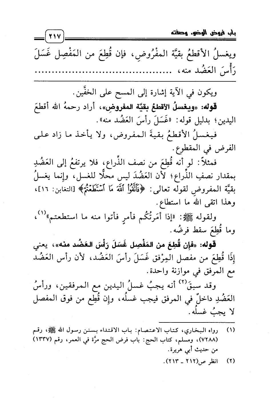 فمثلاً: لو أنه قُطِعَ من نصف الذِّراع، فلا يرتفعُ إلى العَضُدِ بمقدار نصفِ الذِّراع؛ لأن العَضُدَ ليس محلًّا للغسل، وإِنما يغسلُ بقيَّة المفروضِ لقوله تعالى: {فَاتَّقُوا اللَّهَ مَا اسْتَطَعْتُمْ} [التغابن: 16]، وهذا اتقى الله ما استطاع.