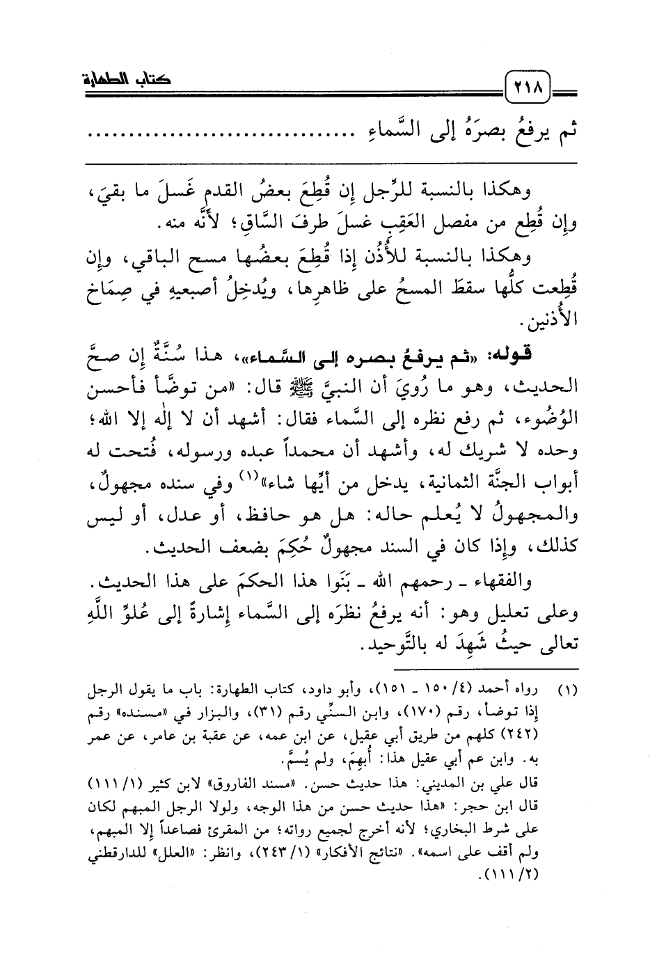 قوله: «ثم يرفعُ بصره إلى السَّماء»، هذا سُنَّةٌ إِن صحَّ الحديث، وهو ما رُويَ أن النبيَّ صلّى الله عليه وسلّم قال: «من توضَّأ فأحسن الوُضُوء، ثم رفع نظره إلى السَّماء فقال: أشهد أن لا إله إلا الله؛ وحده لا شريك له، وأشهد أن محمداً عبده ورسوله، فُتحت له أبواب الجنَّة الثمانية، يدخل من أيِّها شاء» (¬1) وفي سنده مجهولٌ، والمجهولُ لا يُعلم حاله: هل هو حافظ، أو عدل، أو ليس كذلك، وإِذا كان في السند مجهولٌ حُكِمَ بضعف الحديث.