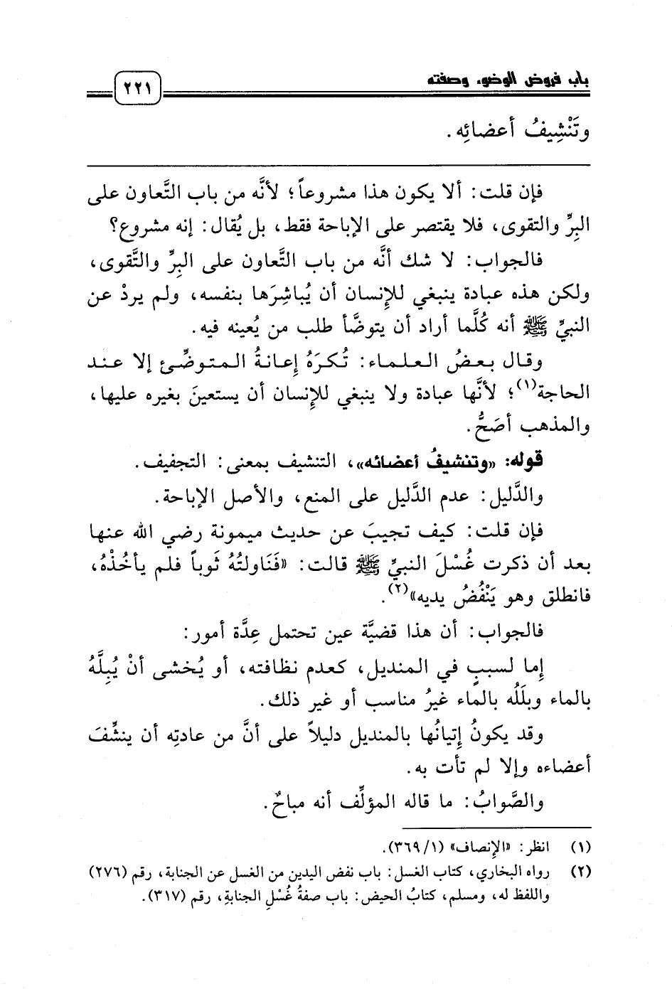 قوله: «وتنشيفُ أعضائه»، التنشيف بمعنى: التجفيف.