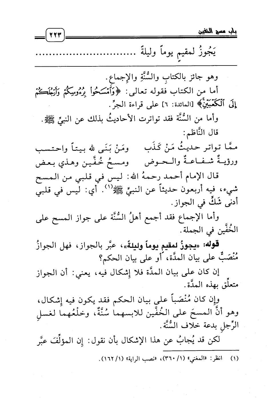 قال الإمام أحمد رحمه الله: ليس في قلبي من المسح شيء، فيه أربعون حديثاً عن النبيِّ صلّى الله عليه وسلّم (¬1). أي: ليس في قلبي أدنى شَكٍّ في الجواز.