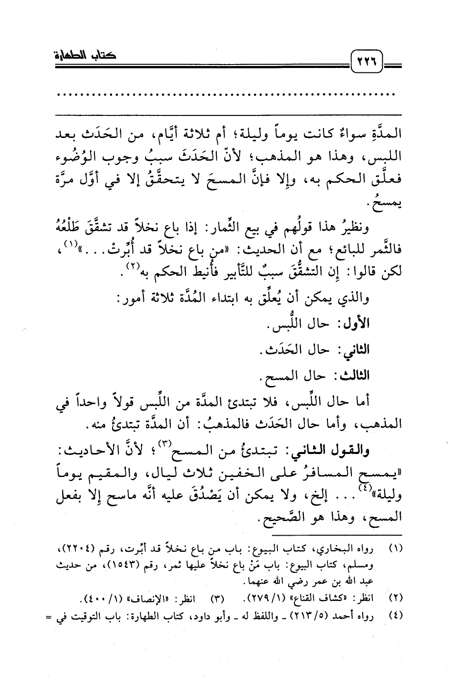 (¬4) رواه أحمد (5/ 213) ـ واللفظ له ـ وأبو داود، كتاب الطهارة: باب التوقيت في المسح، رقم (157)، والترمذي، كتاب الطهارة: باب المسح على الخفين للمسافر