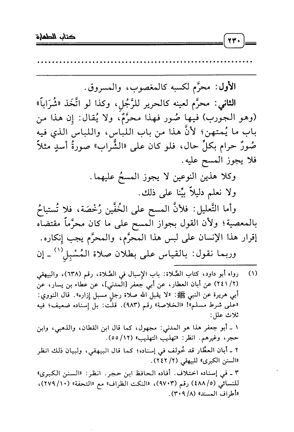 الثاني: محرَّم لعينه كالحرير للرَّجُلِ، وكذا لو اتَّخَذ «شُرَاباً» (وهو الجورب) فيها صُور فهذا محرَّمٌ، ولا يُقال: إِن هذا من باب ما يُمتهن؛ لأنَّ هذا من باب اللباس، واللباس الذي فيه صُورٌ حرام بكلِّ حال، فلو كان على «الشُّراب» صورةُ أسدٍ مثلاً فلا يجوز المسح عليه.