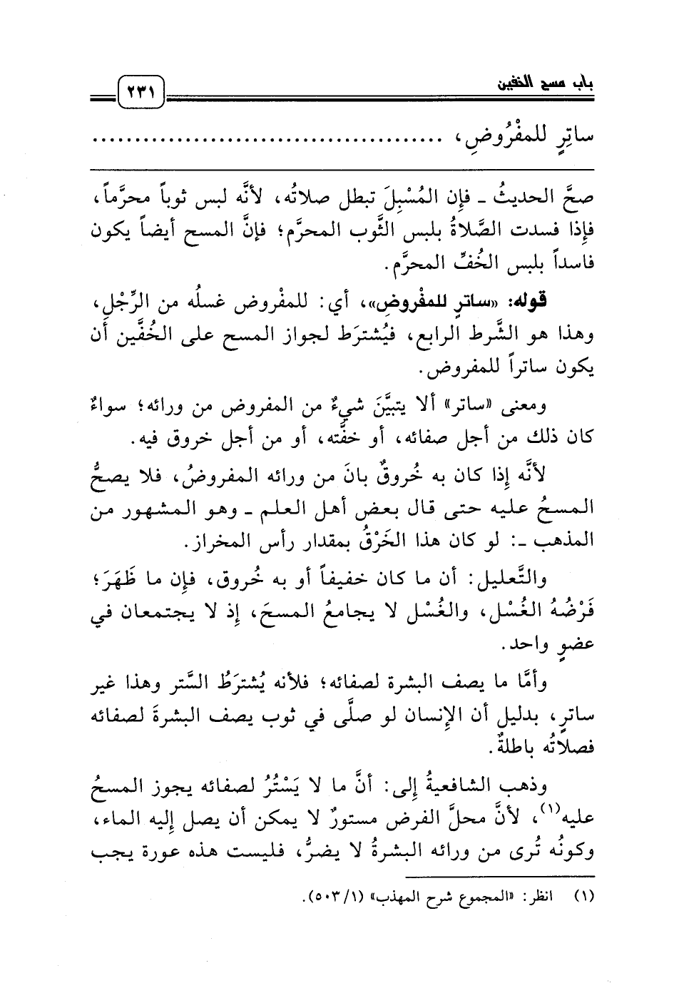 قوله: «ساترٍ للمفْروضِ»، أي: للمفْروض غسلُه من الرِّجْلِ، وهذا هو الشَّرط الرابع، فيُشترَط لجواز المسح على الخُفَّين أن يكون ساتراً للمفروض.