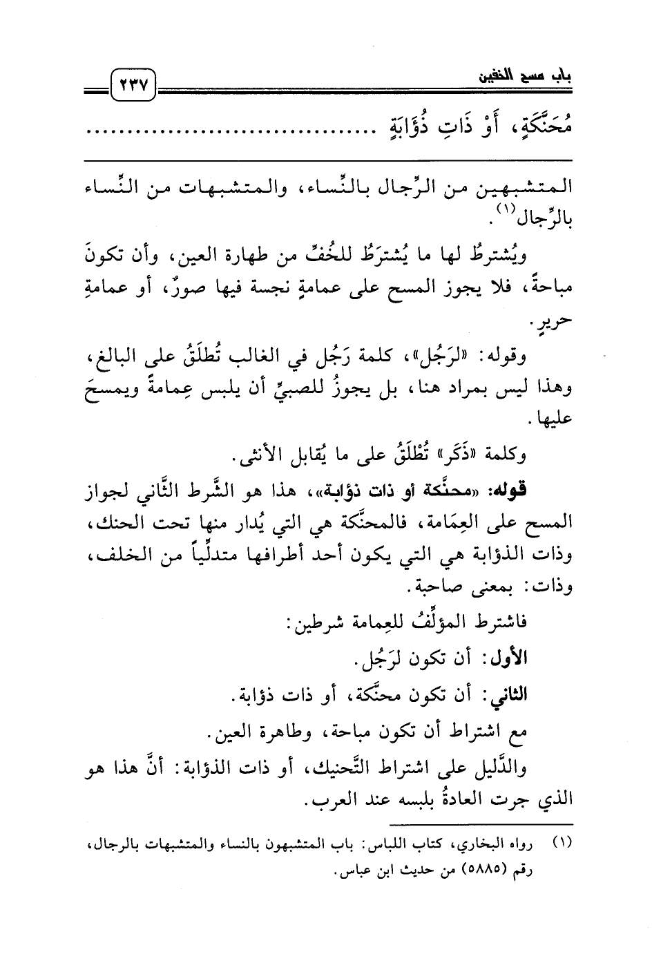 قوله: «محنَّكة أو ذات ذؤابة»، هذا هو الشَّرط الثَّاني لجواز المسح على العِمَامة، فالمحنَّكة هي التي يُدار منها تحت الحنك، وذات الذؤابة هي التي يكون أحد أطرافها متدلِّياً من الخلف، وذات: بمعنى صاحبة.