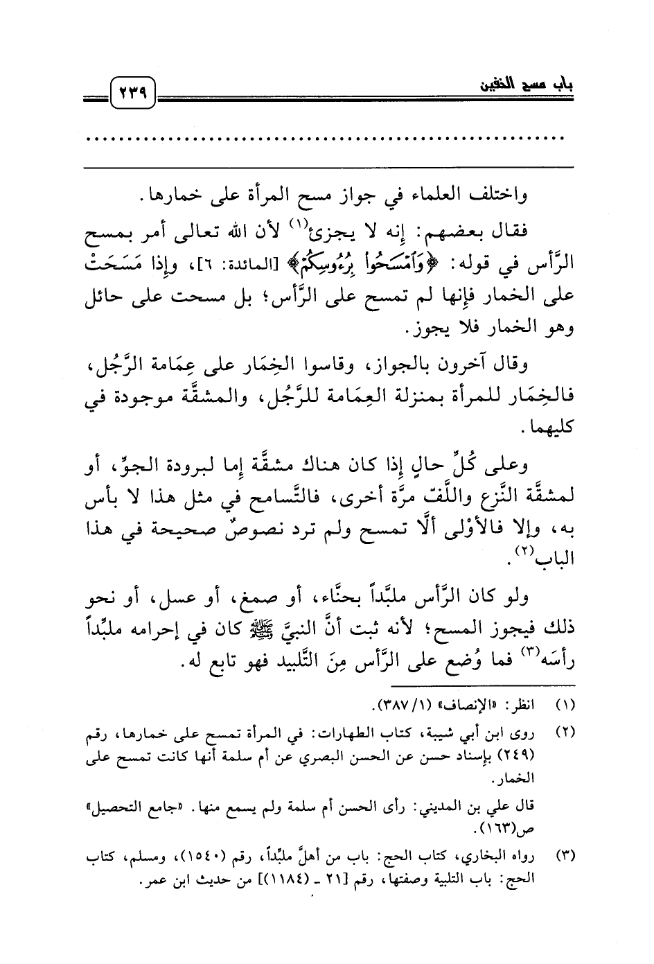 واختلف العلماء في جواز مسح المرأة على خمارها.