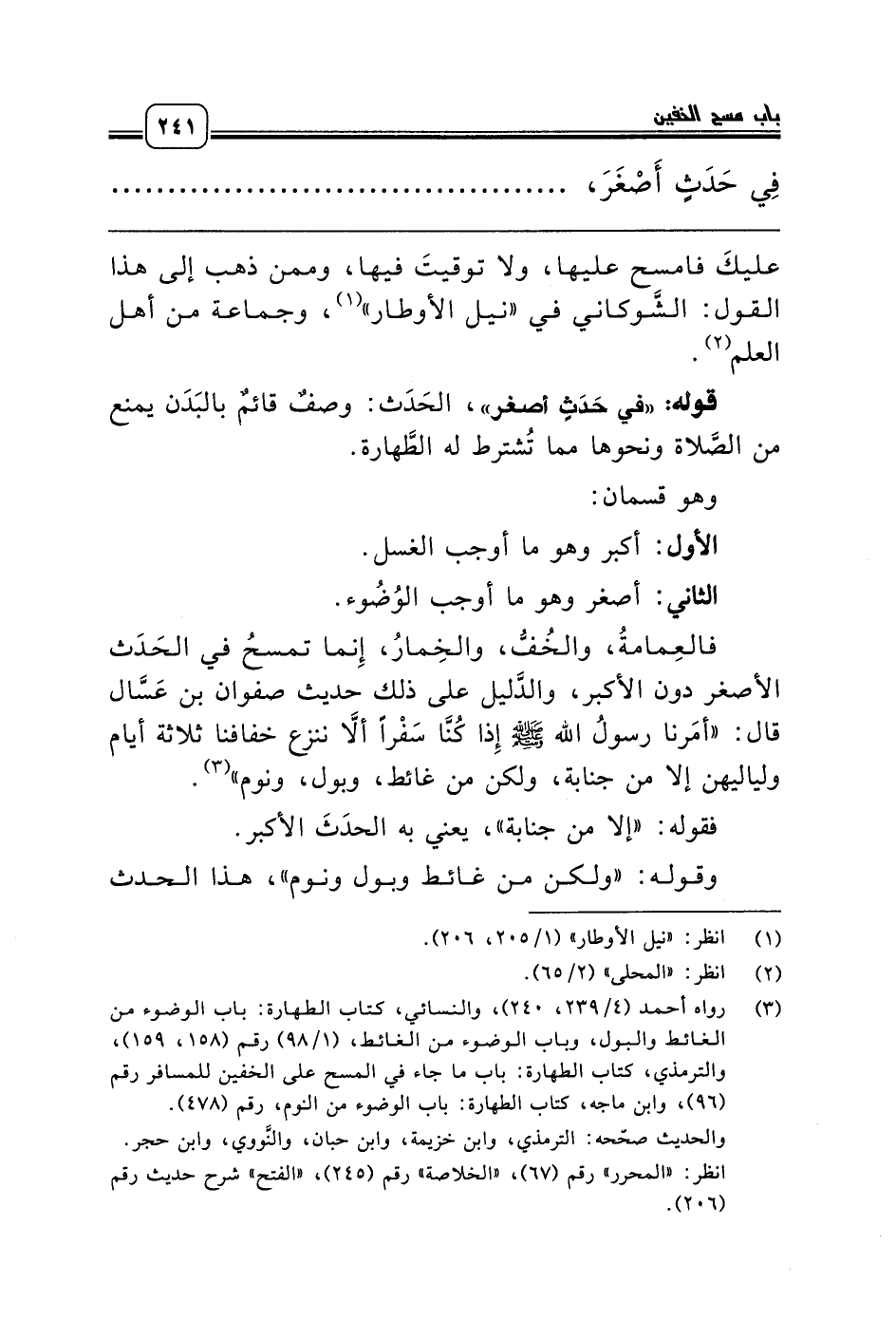 فالعِمامةُ، والخُفُّ، والخِمارُ، إِنما تمسحُ في الحَدَث الأصغر دون الأكبر، والدَّليل على ذلك حديث صفوان بن عَسَّال قال: «أمَرنا رسولُ الله صلّى الله عليه وسلّم إِذا كُنَّا سَفْراً ألاَّ ننزع خفافنا ثلاثة أيام ولياليهن إلا من جنابة، ولكن من غائط، وبول، ونوم» (¬3).