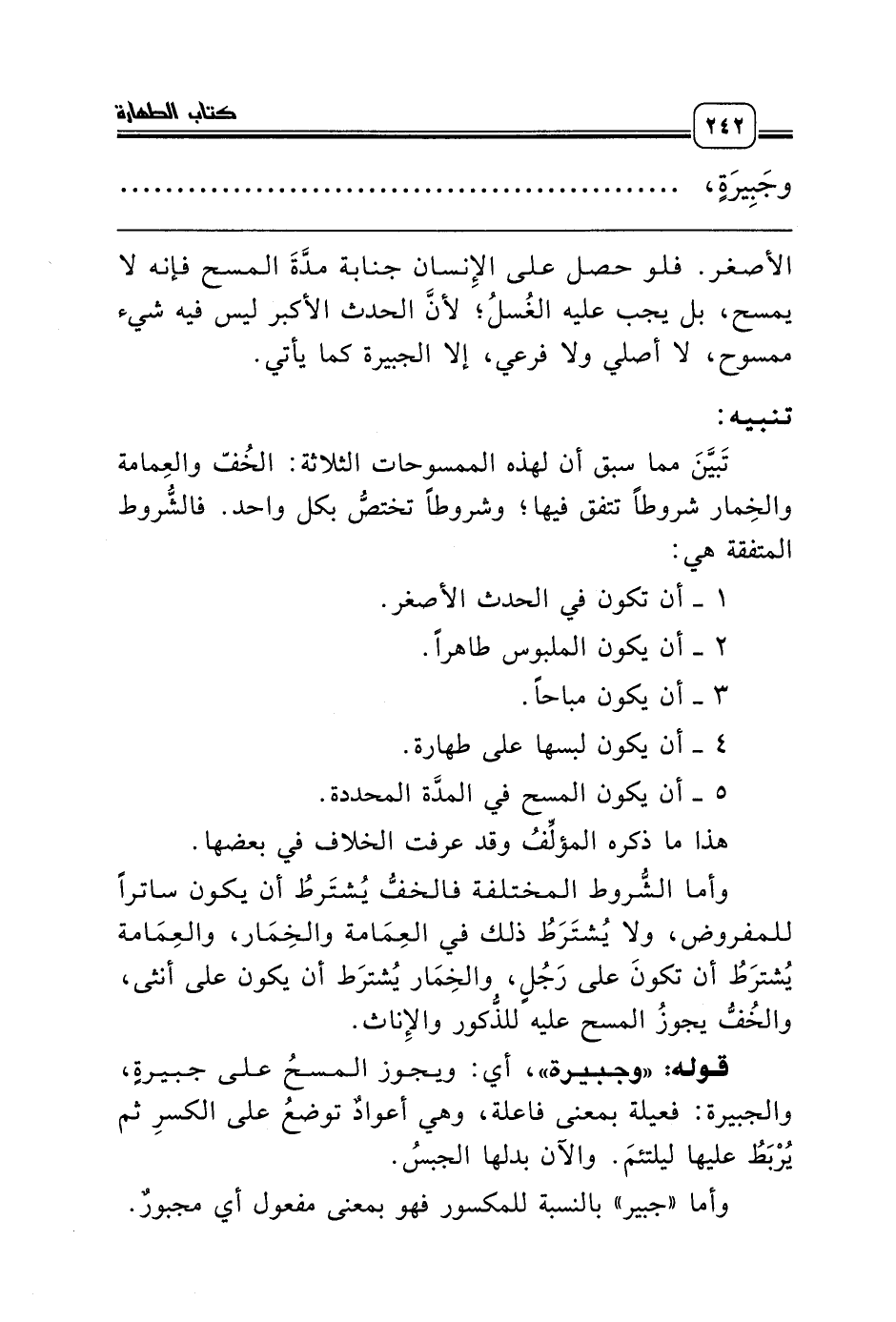 قوله: «وجبيرة»، أي: ويجوز المسحُ على جبيرةٍ، والجبيرة: فعيلة بمعنى فاعلة، وهي أعوادٌ توضعُ على الكسرِ ثم يُرْبَطُ عليها ليلتئمَ. والآن بدلها الجبسُ.