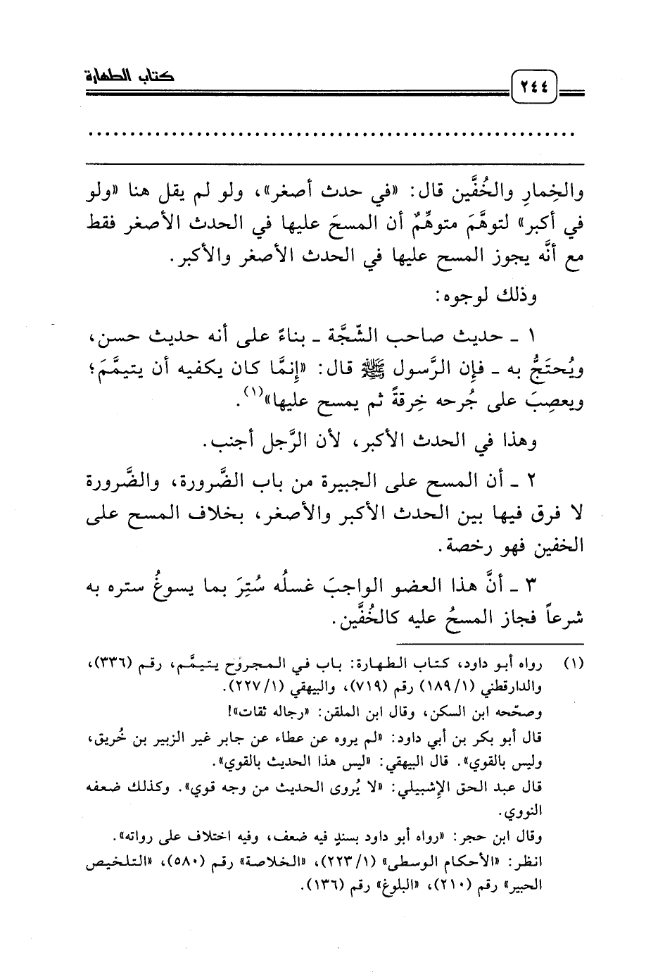 1 ـ حديث صاحب الشّجَّة ـ بناءً على أنه حديث حسن، ويُحتَجُّ به ـ فإِن الرَّسول صلّى الله عليه وسلّم قال: «إِنمَّا كان يكفيه أن يتيمَّمَ؛ ويعصِبَ على جُرحه خِرقةً ثم يمسح عليها» (¬1).