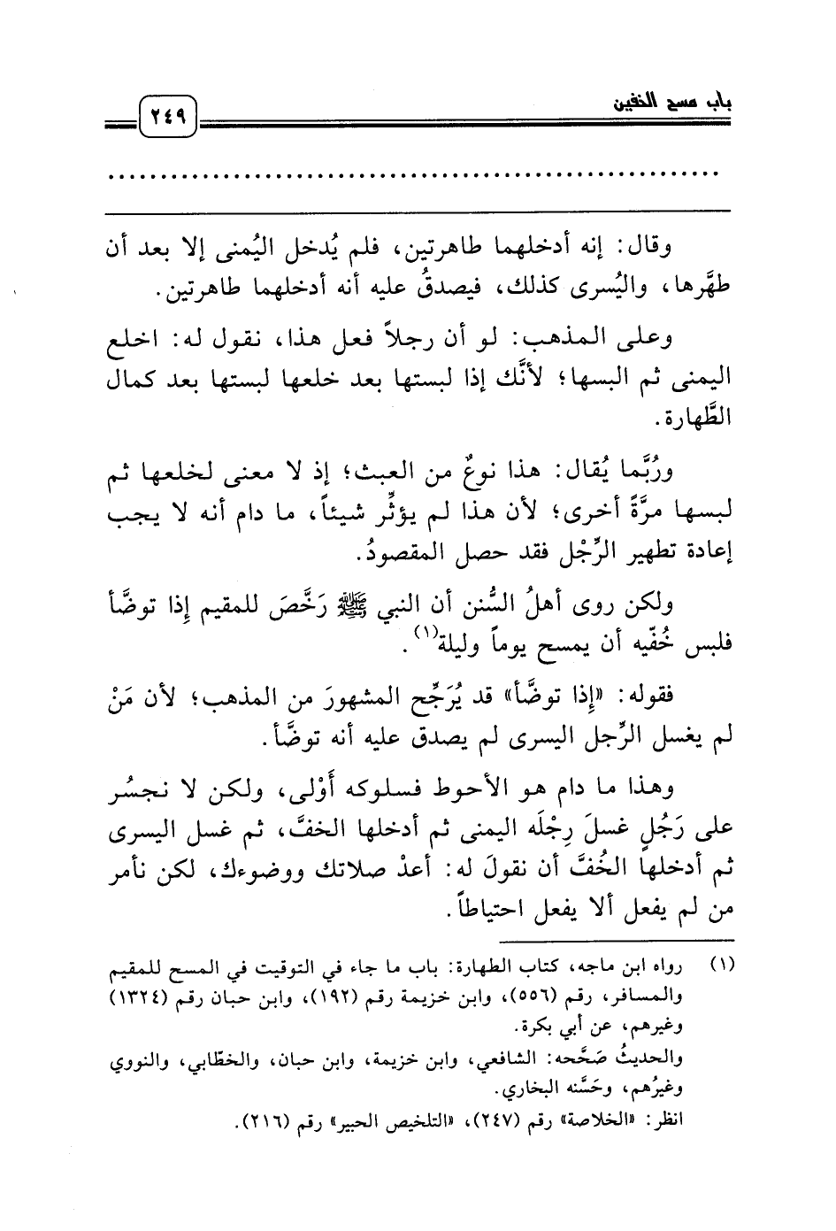 ولكن روى أهلُ السُّنن أن النبي صلّى الله عليه وسلّم رَخَّصَ للمقيم إِذا توضَّأ فلبس خُفّيه أن يمسح يوماً وليلة (¬1) .....