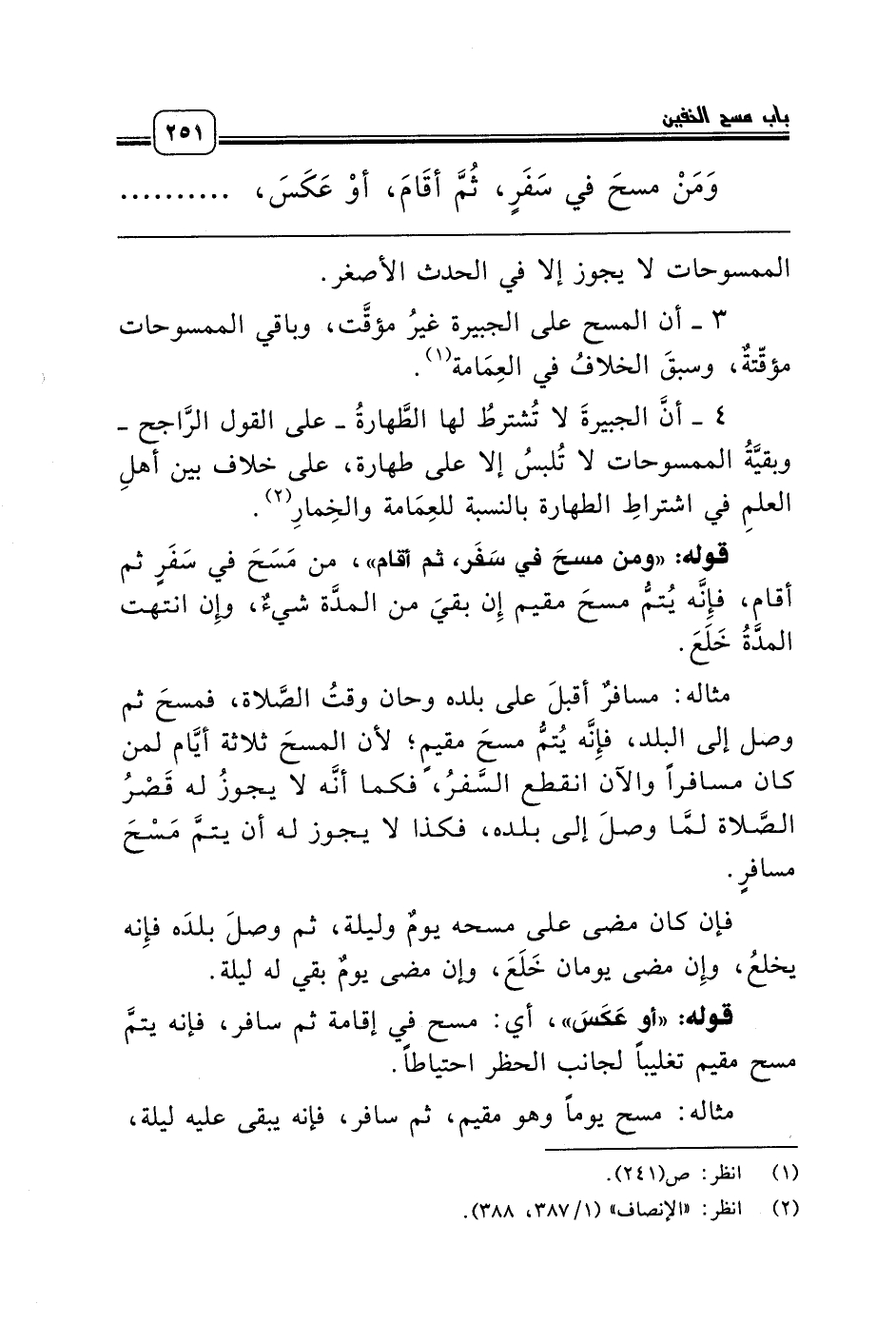قوله: «ومن مسحَ في سَفَر، ثم أقام»، من مَسَحَ في سَفَرٍ ثم أقام، فإِنَّه يُتمُّ مسحَ مقيم إِن بقيَ من المدَّة شيءٌ، وإِن انتهت المدَّةُ خَلَعَ.