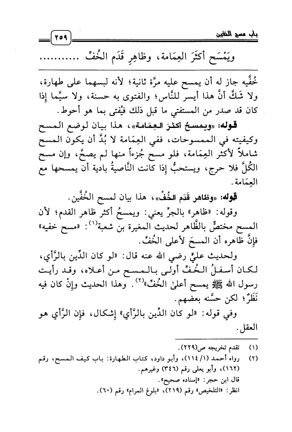 ولحديث عليٍّ رضي الله عنه قال: «لو كان الدِّين بالرَّأي، لكان أسفلُ الخُفِّ أولى بالمسح من أعلاه، وقد رأيت رسول الله صلّى الله عليه وسلّم يمسح أعلى الخُفِّ» (¬2). وهذا الحديث وإِنْ كان فيه نَظَرٌ؛ لكن حسَّنه بعضهم.