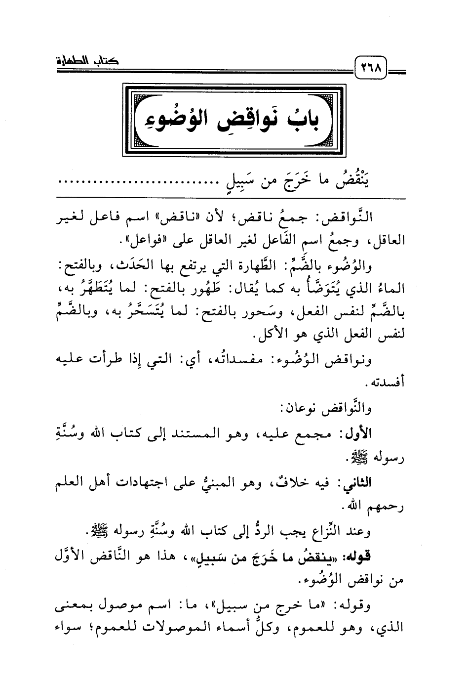 قوله: «ينقضُ ما خَرَجَ من سَبيلٍ»، هذا هو النَّاقض الأوَّل من نواقض الوُضُوء.