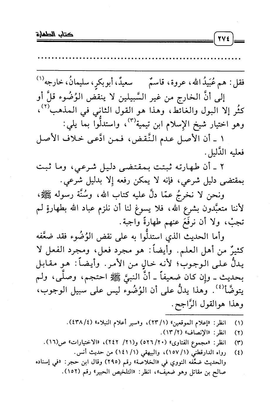 ونحن لا نخرجُ عمّا دلَّ عليه كتاب الله، وسُنَّة رسوله صلّى الله عليه وسلّم، لأننا متعبَّدون بشرع الله، فلا يسوغ لنا أن نلزم عباد الله بطهارةٍ لم تجبْ، ولا أن نرفَعَ عنهم طهارةً واجبة .....