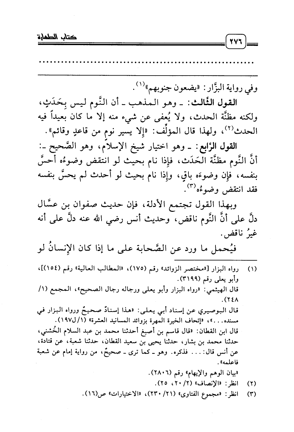 القول الرَّابع: ـ وهو اختيار شيخ الإسلام، وهو الصَّحيح ـ: أنَّ النَّوم مظنَّة الحَدَث، فإِذا نام بحيث لو انتقض وضوءُه أحسَّ بنفسه، فإِن وضوءَه باقٍ، وإِذا نام بحيث لو أحدث لم يحسَّ بنفسه فقد انتقض وضوءُه (¬3).