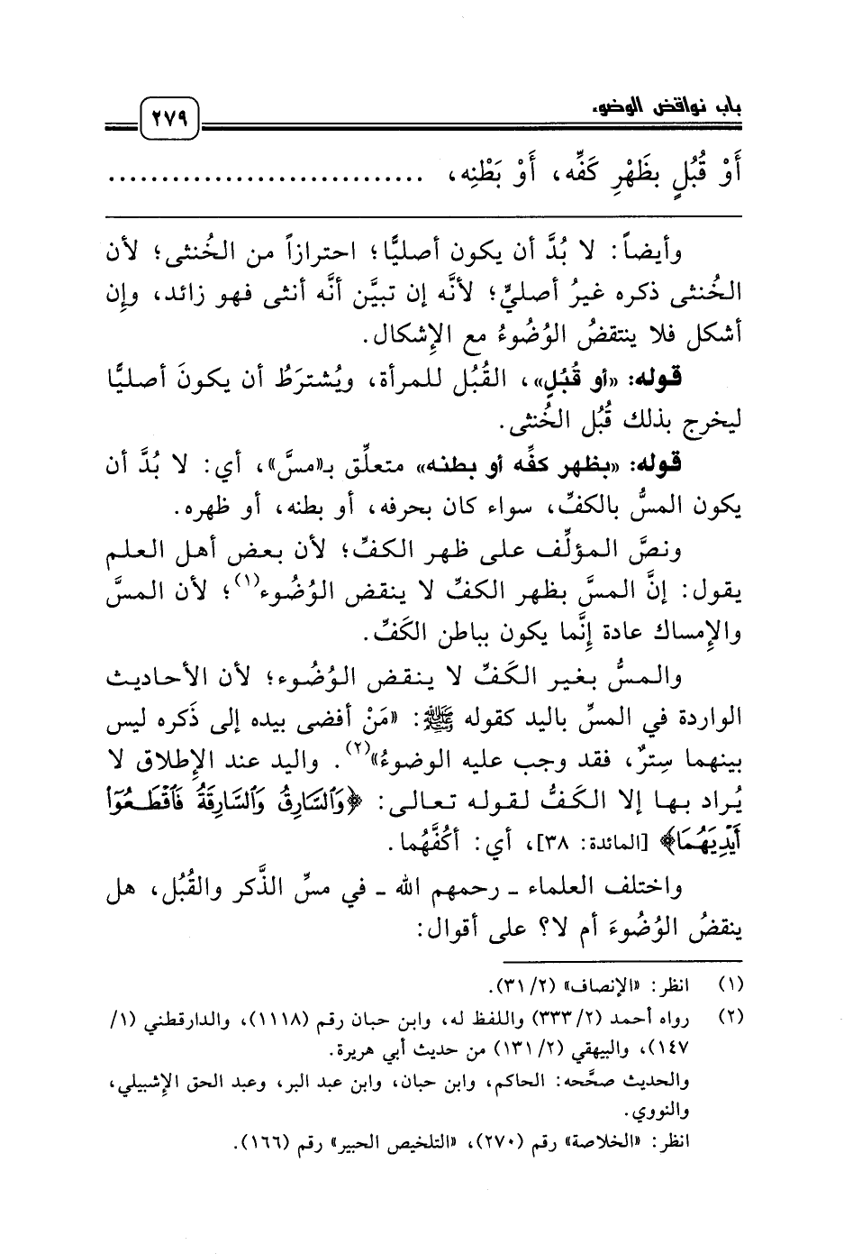 والمسُّ بغير الكَفِّ لا ينقض الوُضُوء؛ لأن الأحاديث الواردة في المسِّ باليد كقوله صلّى الله عليه وسلّم: «مَنْ أفضى بيده إلى ذَكره ليس بينهما سِترٌ، فقد وجب عليه الوضوءُ» (¬2). واليد عند الإِطلاق لا يُراد بها إلا الكَفُّ لقوله تعالى: {وَالسَّارِقُ وَالسَّارِقَةُ فَاقْطَعُوا أَيدِيَهُمَا} [المائدة: 38]، أي: أكُفَّهُما.