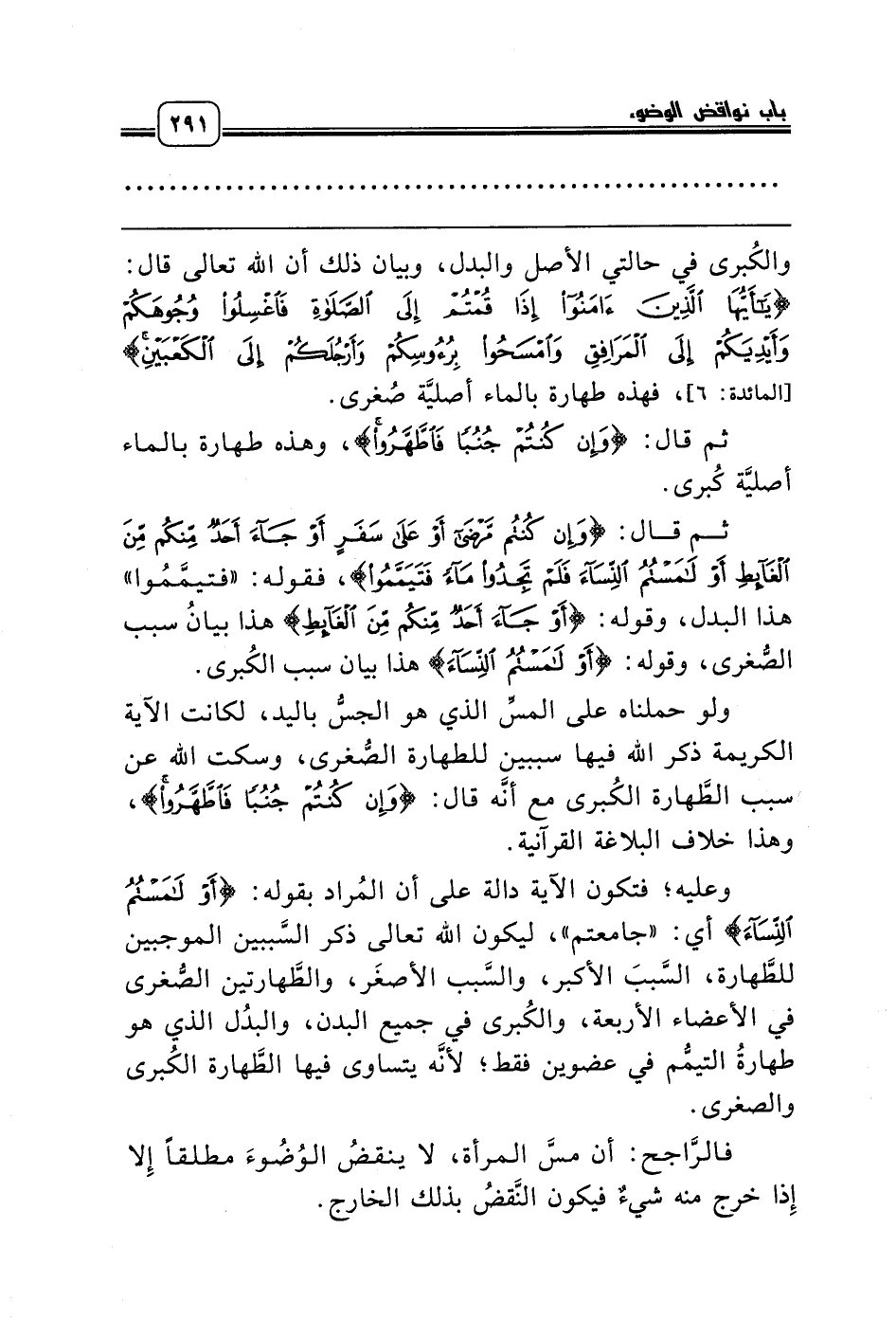 ولو حملناه على المسِّ الذي هو الجسُّ باليد، لكانت الآية الكريمة ذكر الله فيها سببين للطهارة الصُّغرى، وسكت الله عن سبب الطَّهارة الكُبرى مع أنَّه قال: {وَإِنْ كُنْتُمْ جُنُبًا فَاطَّهَّرُوا}، وهذا خلاف البلاغة القرآنية .....