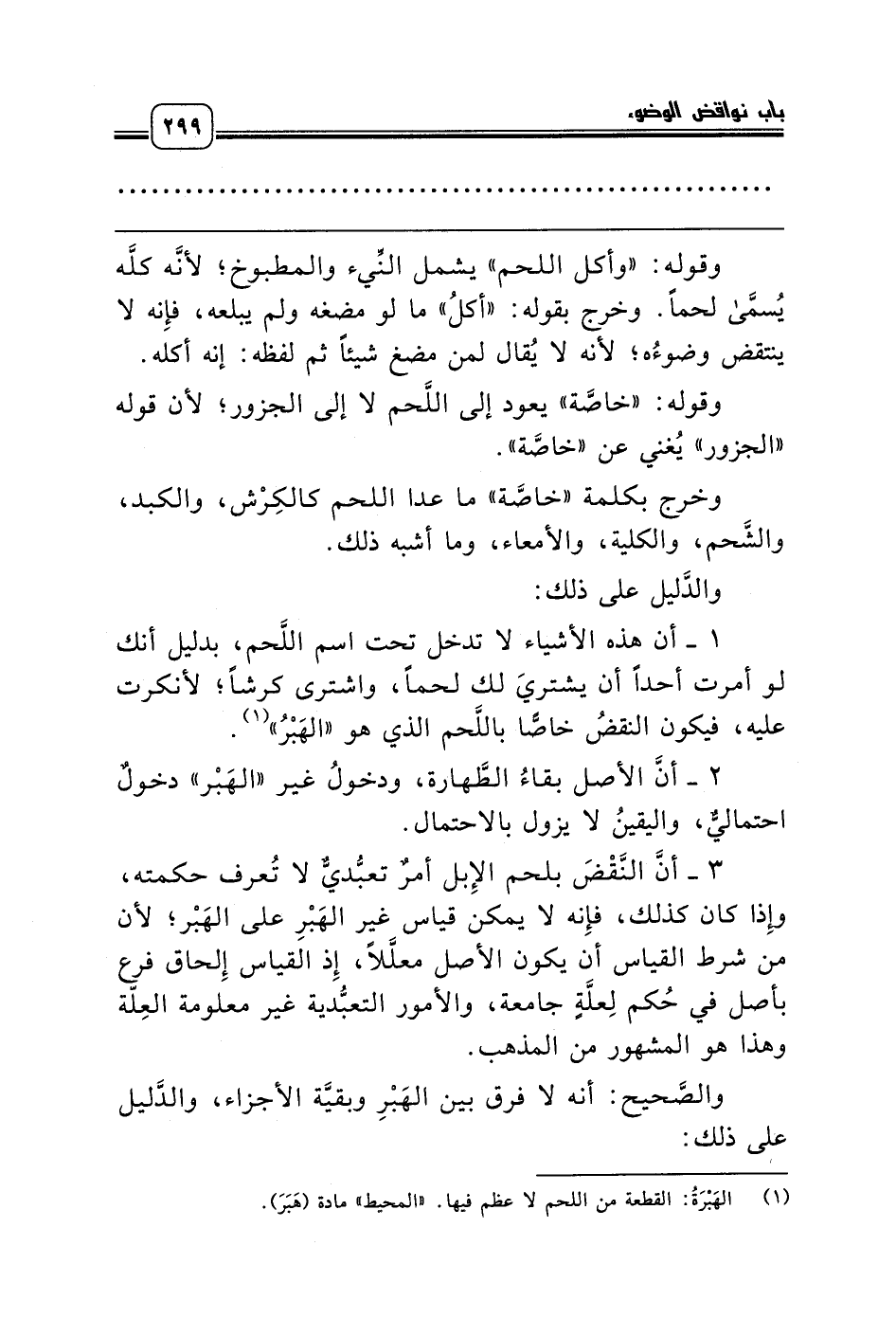 3 - أنَّ النَّقْضَ بلحم الإِبل أمرٌ تعبُّديٌّ لا تُعرف حكمته، وإِذا كان كذلك، فإِنه لا يمكن قياس غير الهَبْرِ على الهَبْر؛ لأن من شرط القياس أن يكون الأصل معلَّلاً، إِذ القياس إِلحاق فرع بأصل في حُكم لِعلَّةٍ جامعة، والأمور التعبُّدية غير معلومة العِلّة وهذا هو المشهور من المذهب.