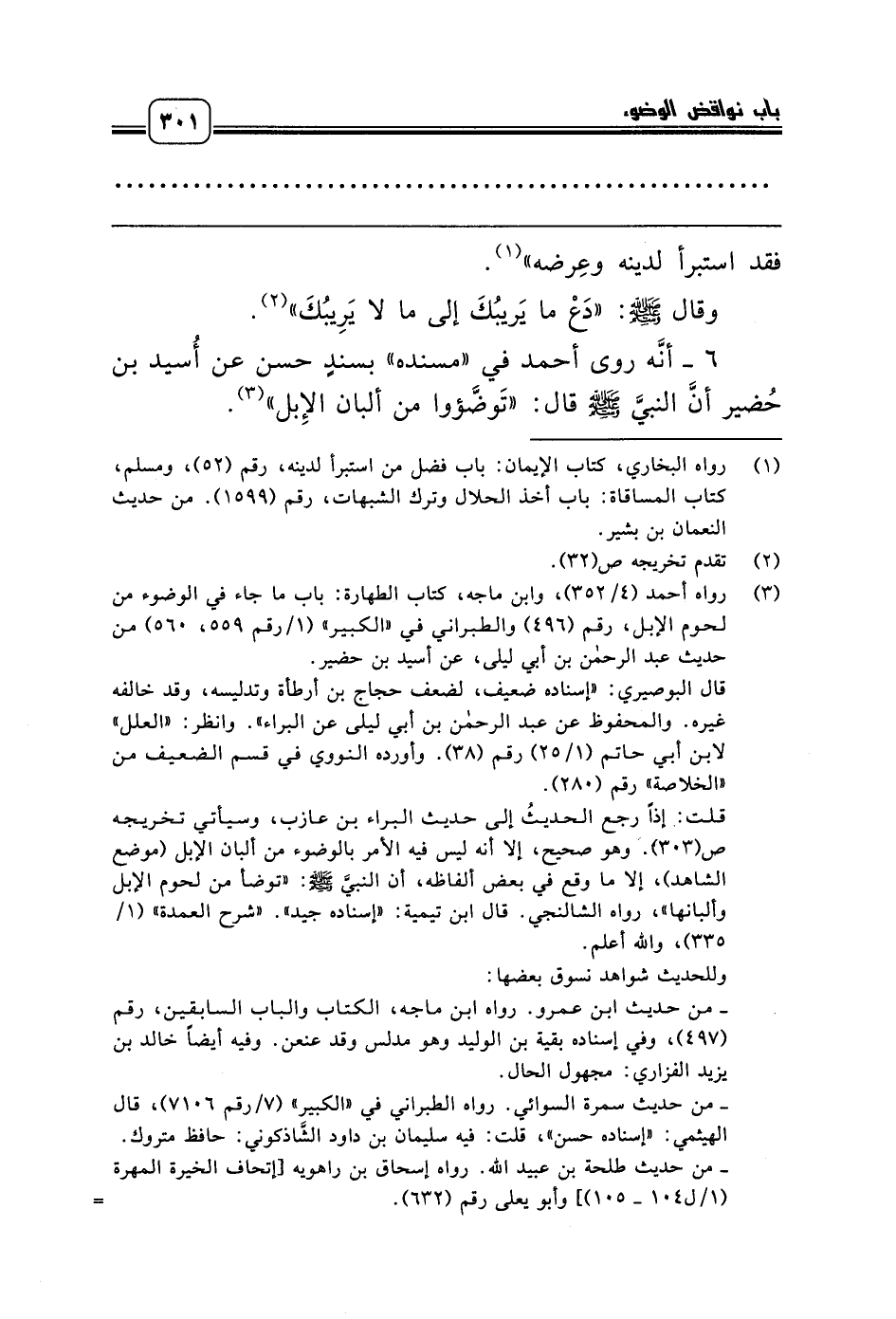 6 - أنَّه روى أحمد في «مسنده» بسندٍ حسن عن أُسيد بن حُضير أنَّ النبيَّ صلّى الله عليه وسلّم قال: «تَوضَّؤوا من ألبان الإِبل» (¬3) .....