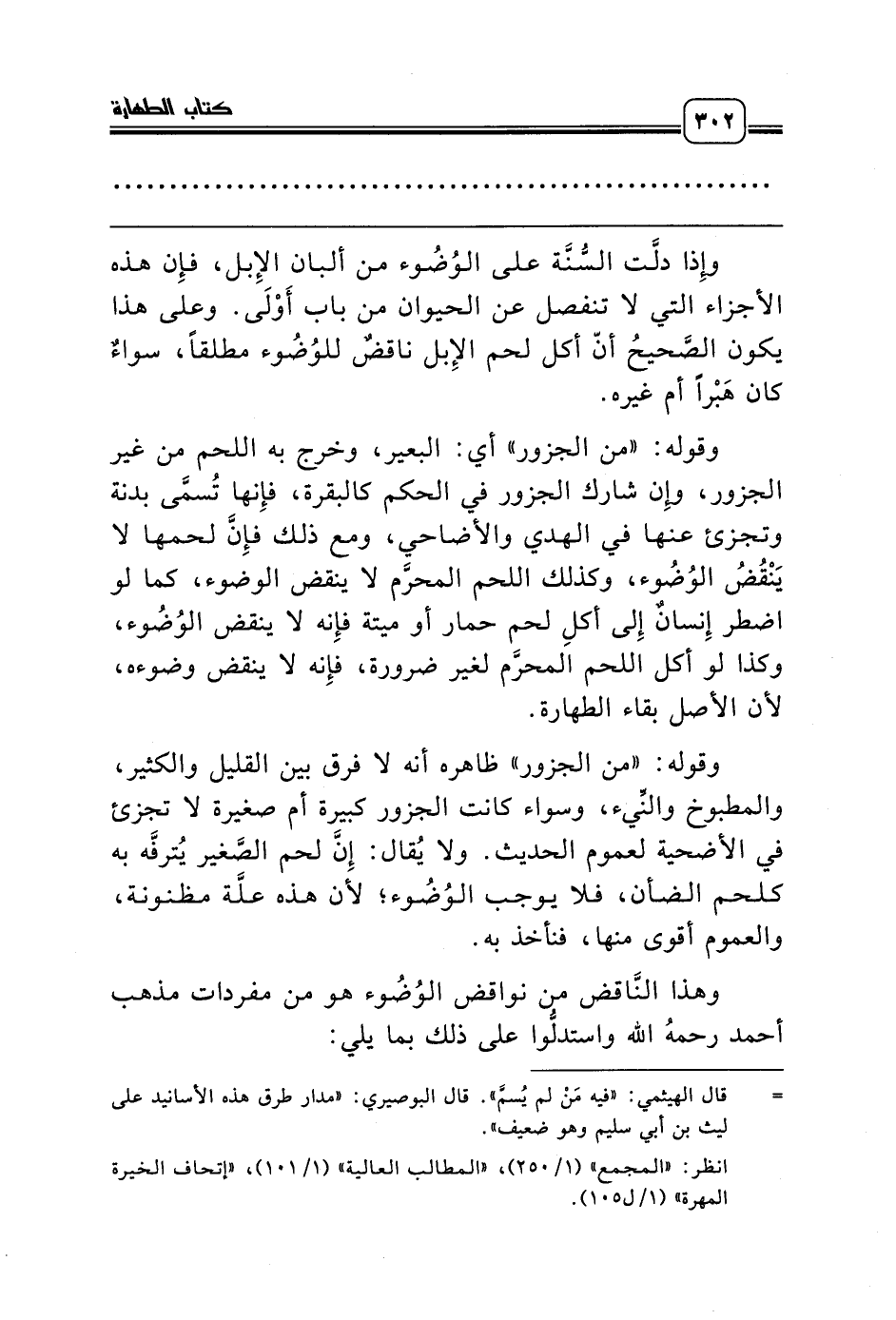وإِذا دلَّت السُّنَّة على الوُضُوء من ألبان الإِبل، فإِن هذه الأجزاء التي لا تنفصل عن الحيوان من باب أَوْلَى. وعلى هذا يكون الصَّحيحُ أنّ أكل لحم الإِبل ناقضٌ للوُضُوء مطلقاً، سواءٌ كان هَبْراً أم غيره.