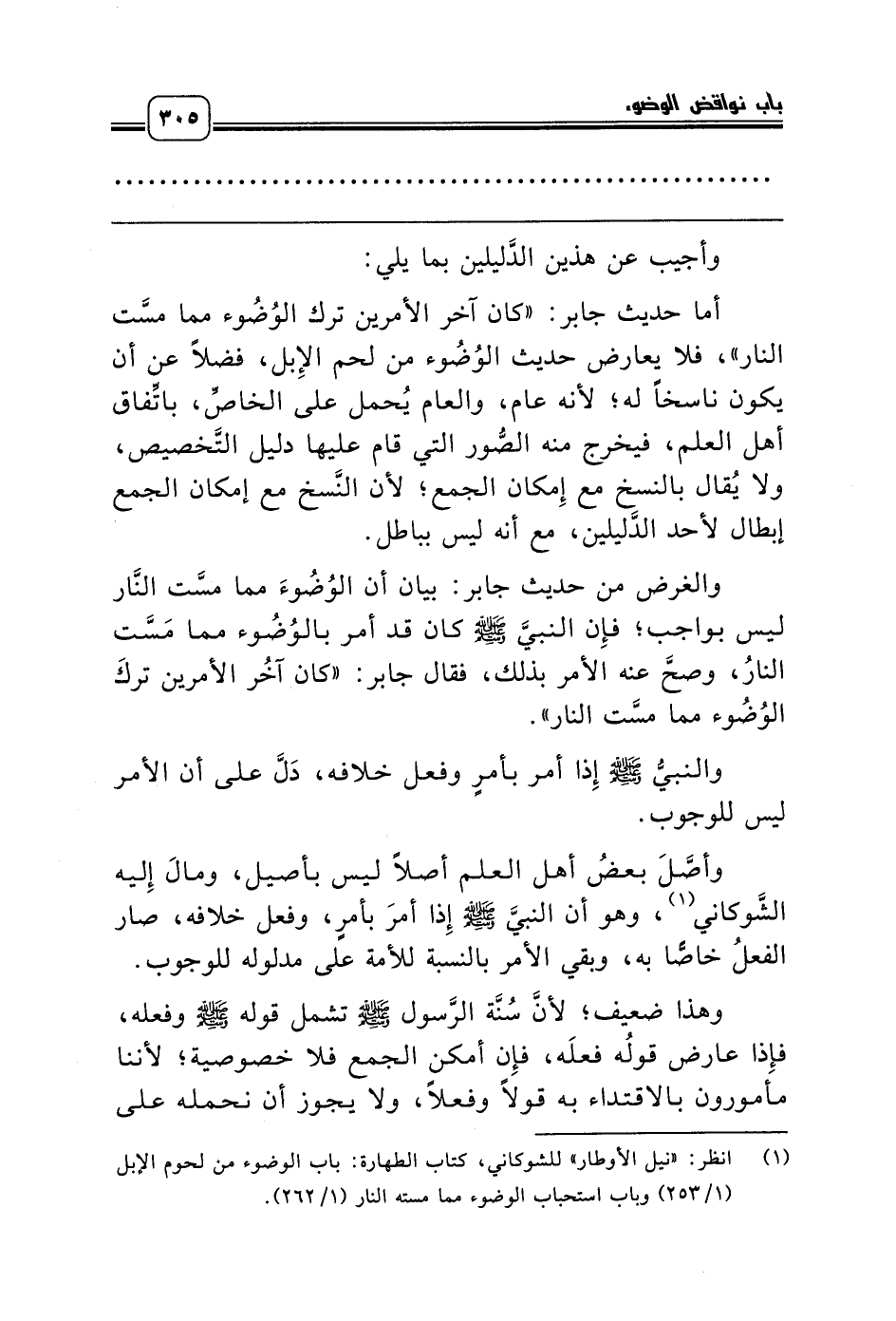(¬1) انظر: «نيل الأوطار» للشوكاني، كتاب الطهارة: باب الوضوء من لحوم الإبل (1/ 253) وباب استحباب الوضوء مما مسته النار (1/ 262).