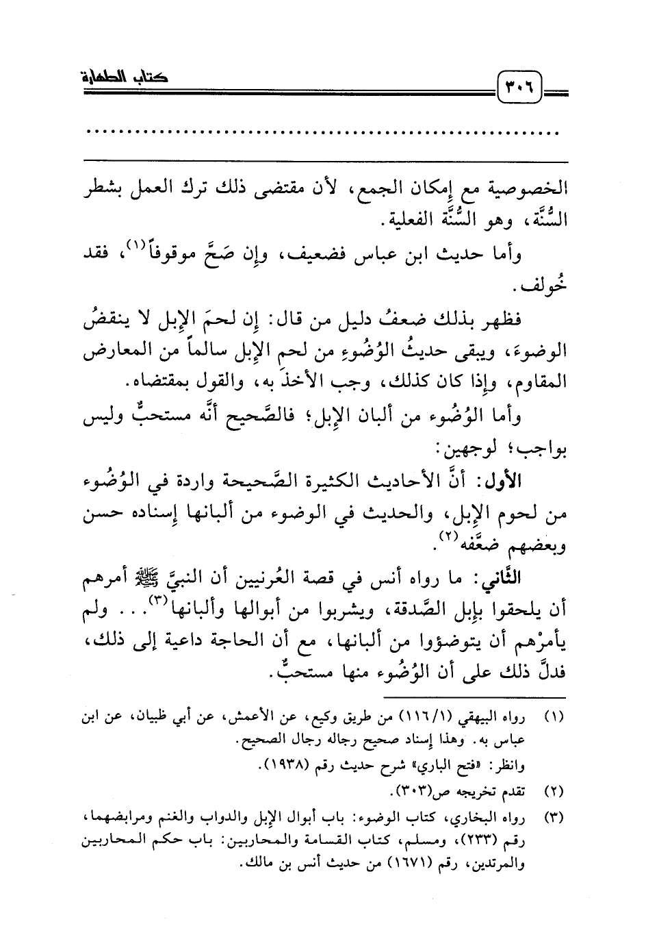 الأول: أنَّ الأحاديث الكثيرة الصَّحيحة واردة في الوُضُوء من لحوم الإِبل، والحديث في الوضوء من ألبانها إِسناده حسن وبعضهم ضعَّفه (¬2).