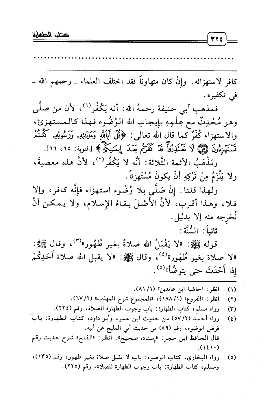 فمذهب أبي حنيفة رحمه الله: أنه يَكْفُر (¬1)، لأن من صلَّى وهو مُحْدِثٌ مع عِلْمِهِ بإِيجاب الله الوُضُوء فهذا كالمستهزئ، والاستهزاء كُفْرٌ كما قال الله تعالى: {قُلْ أَبِاللَّهِ وَآيَاتِهِ وَرَسُولِهِ كُنْتُمْ تَسْتَهْزِئُونَ}} [التوبة: 65، 66].