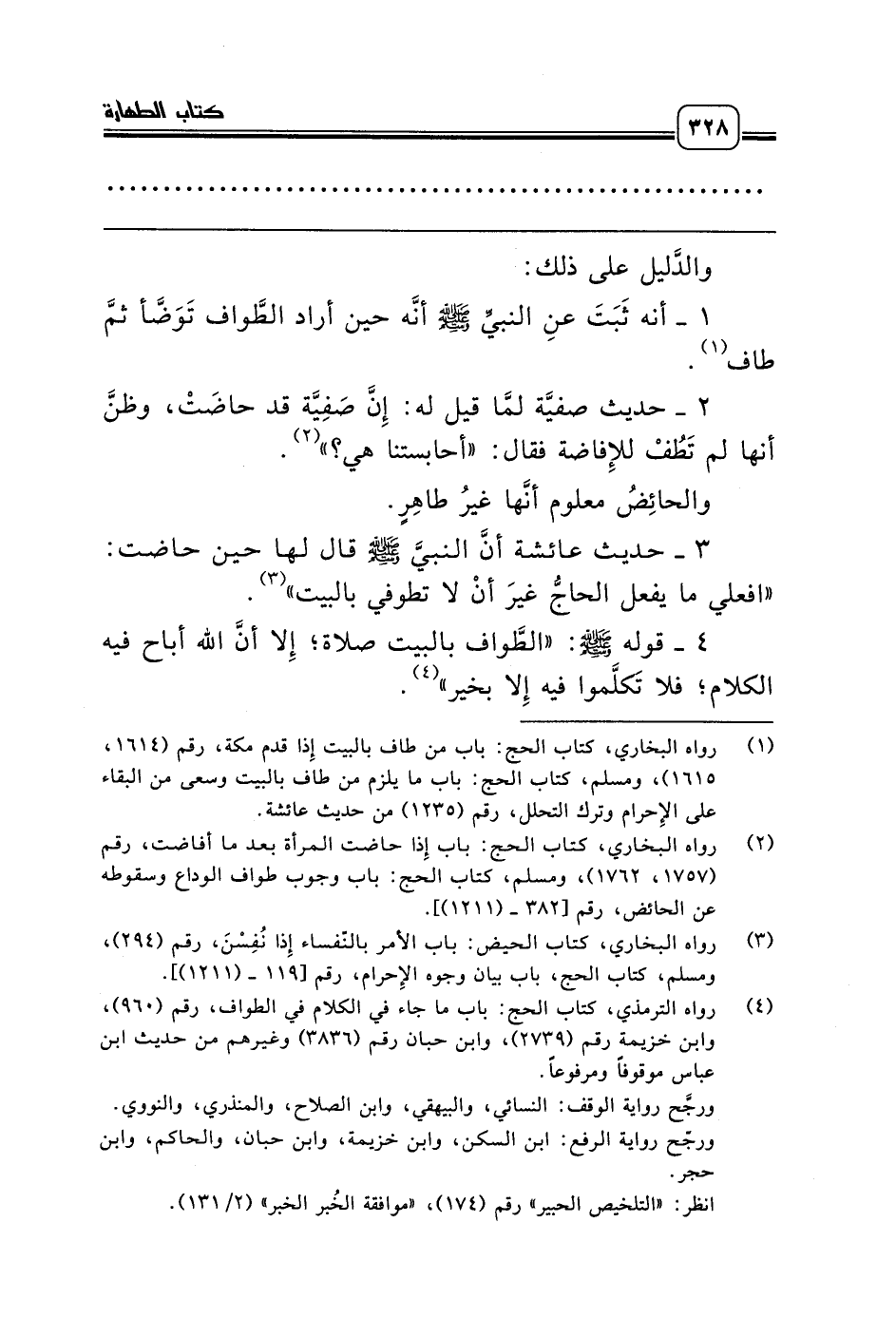 4 ـ قوله صلّى الله عليه وسلّم: «الطَّواف بالبيت صلاة؛ إِلا أنَّ الله أباح فيه الكلام؛ فلا تَكلَّموا فيه إِلا بخير» (¬4) .....
