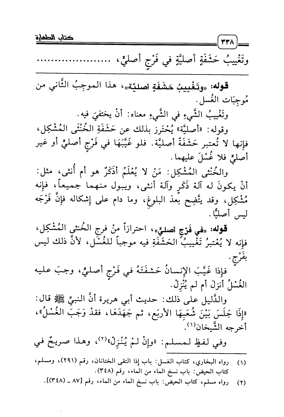 (¬1) رواه البخاري، كتاب الغسل: باب إِذا التقى الختانان، رقم (291)، ومسلم، كتاب الحيض: باب نسخ الماء من الماء، رقم (348).