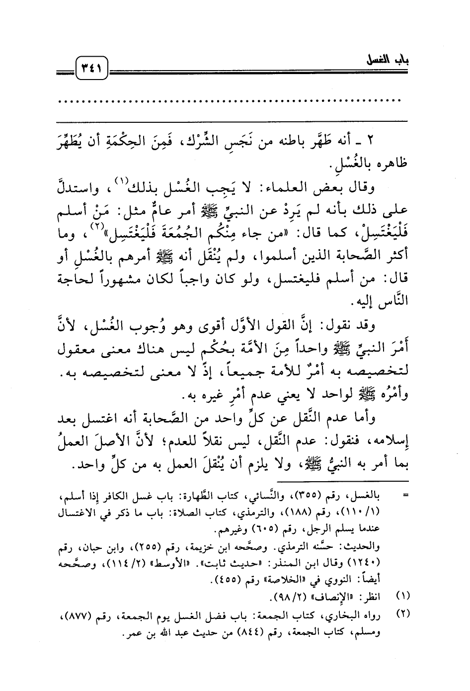 وقال بعض العلماء: لا يَجِب الغُسْل بذلك (¬1)، واستدلَّ على ذلك بأنه لم يَرِدْ عن النبيِّ صلّى الله عليه وسلّم أمر عامٌّ مثل: مَنْ أسلم فَلْيَغْتَسِلْ، كما قال: «من جاء مِنْكُم الجُمُعَةَ فَلْيَغْتَسِل» (¬2)، وما أكثر الصَّحابة الذين أسلموا، ولم يُنْقَل أنه صلّى الله عليه وسلّم أمرهم بالغُسْلِ أو قال: من أسلم فليغتسل، ولو كان واجباً لكان مشهوراً لحاجة النَّاس إليه.